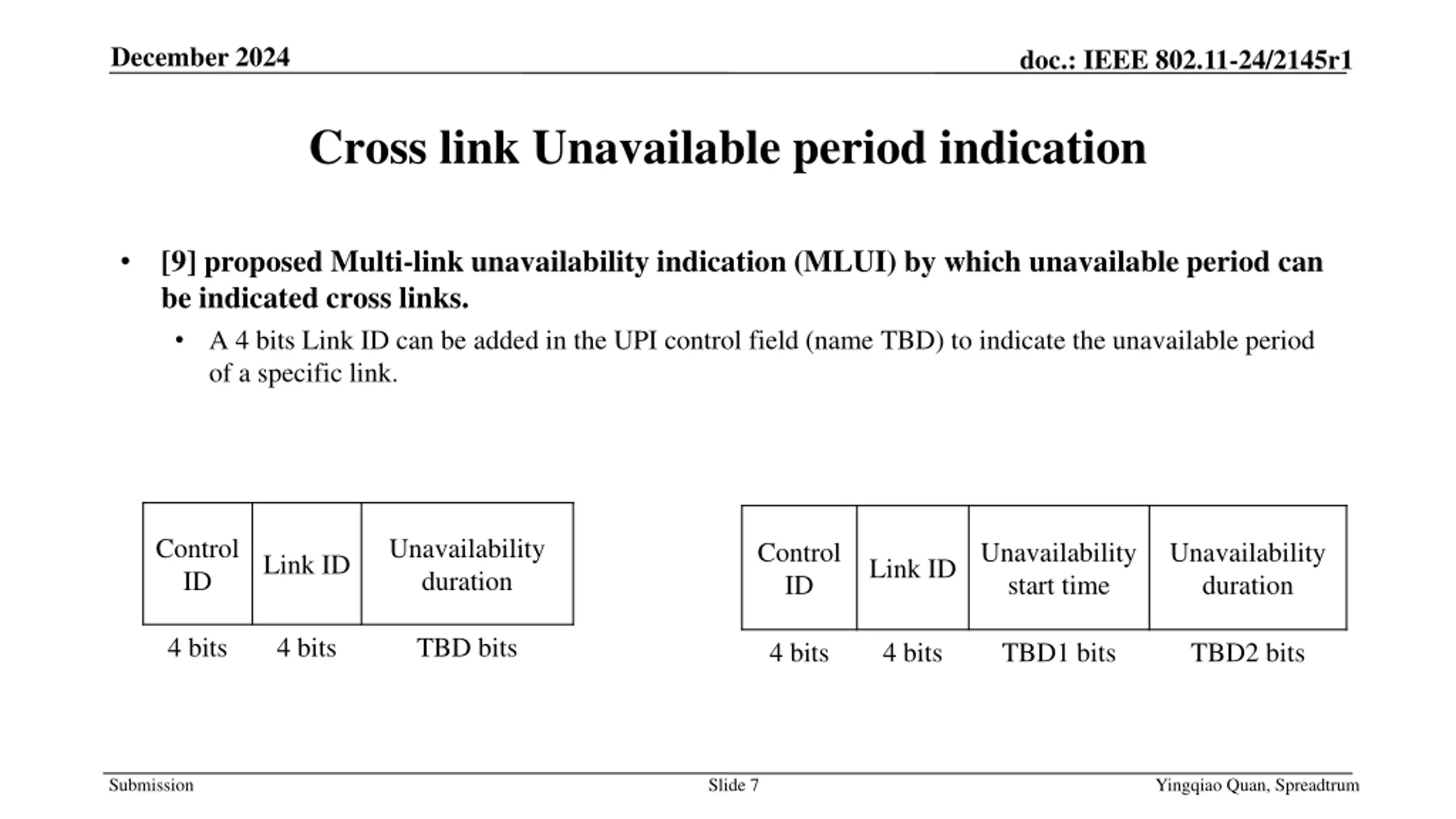 December 2024 doc.: IEEE 802.11-24/2145r1 Cross link Unavailable period indication [9] proposed Multi-link unavailability indication (MLUI) by which unavailable period can be indicated cross links. A 4 bits Link ID can be added in the UPI control field (name TBD) to indicate the unavailable period of a specific link. Control ID Unavailability duration Control ID Unavailability start time Unavailability duration Link ID Link ID 4 bits 4 bits TBD bits 4 bits 4 bits TBD1 bits TBD2 bits Submission Slide 7 Yingqiao Quan, Spreadtrum