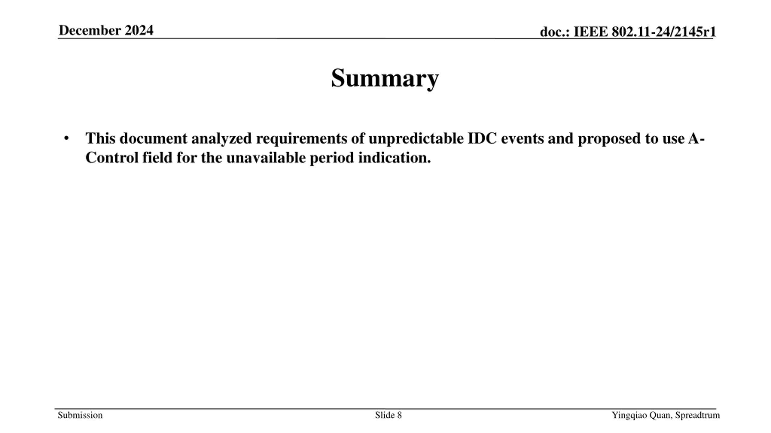 December 2024 doc.: IEEE 802.11-24/2145r1 Summary This document analyzed requirements of unpredictable IDC events and proposed to use A- Control field for the unavailable period indication. Submission Slide 8 Yingqiao Quan, Spreadtrum