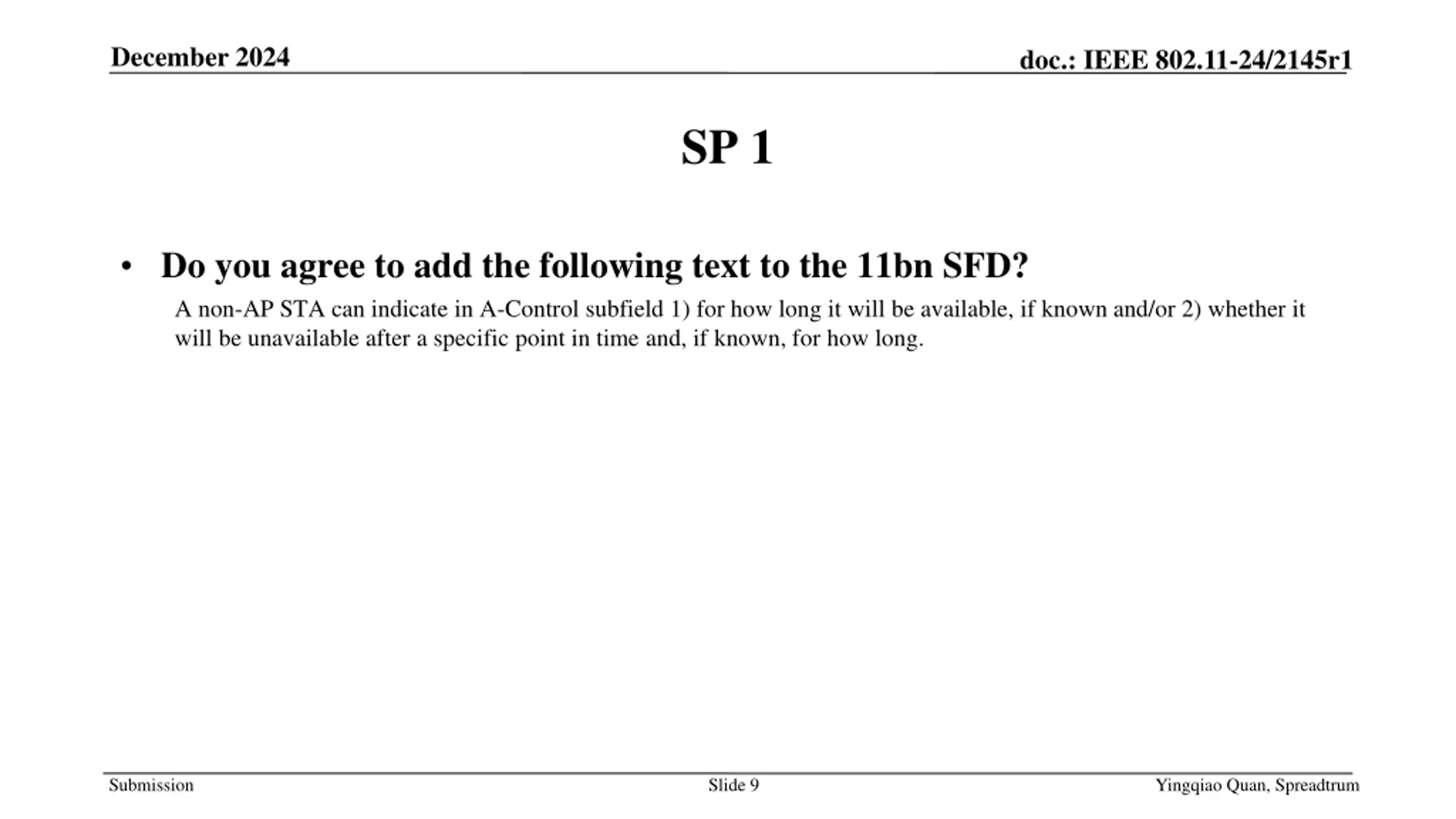December 2024 doc.: IEEE 802.11-24/2145r1 SP 1 Do you agree to add the following text to the 11bn SFD? A non-AP STA can indicate in A-Control subfield 1) for how long it will be available, if known and/or 2) whether it will be unavailable after a specific point in time and, if known, for how long. Submission Slide 9 Yingqiao Quan, Spreadtrum