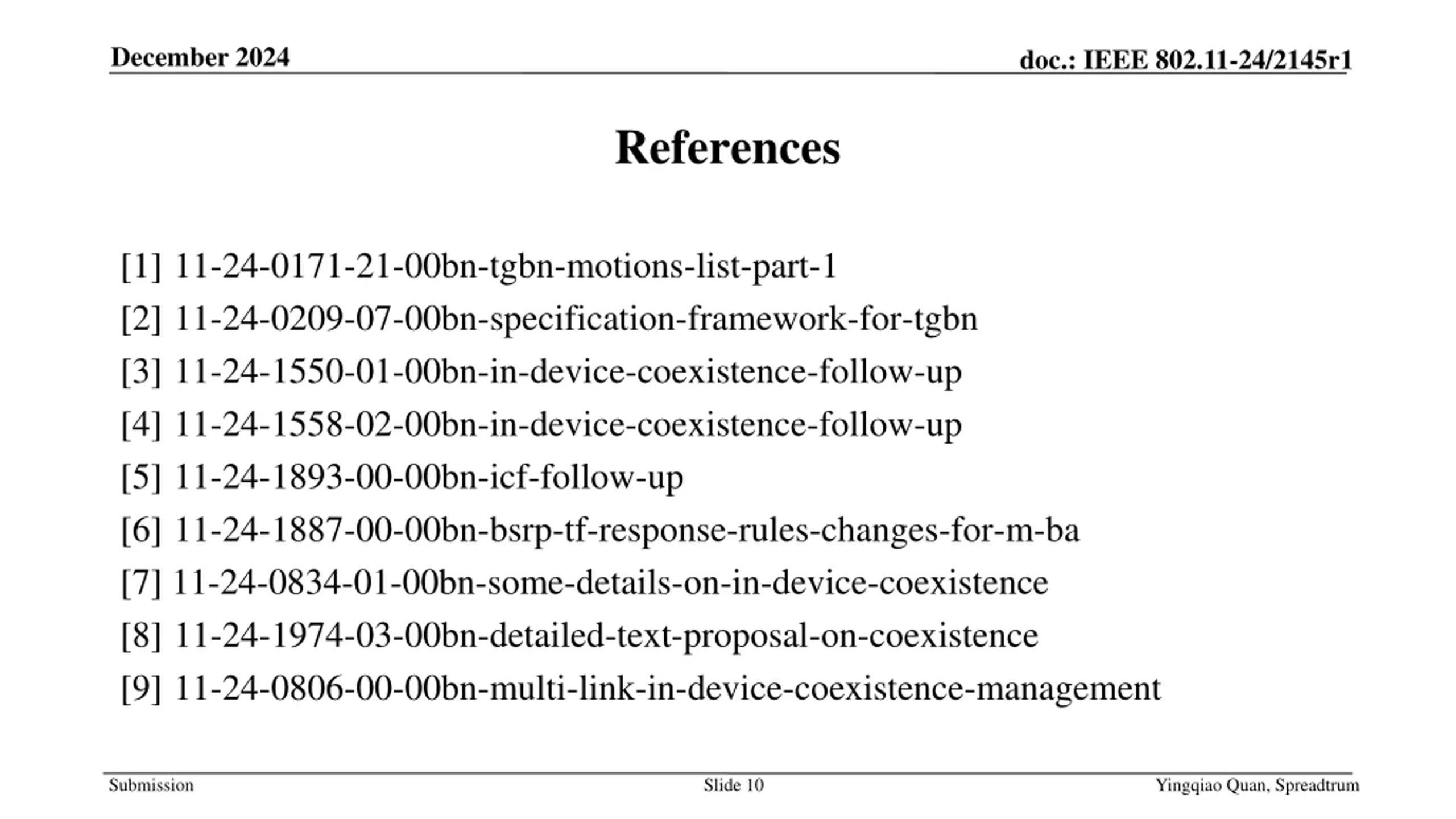 December 2024 doc.: IEEE 802.11-24/2145r1 References [1] 11-24-0171-21-00bn-tgbn-motions-list-part-1 [2] 11-24-0209-07-00bn-specification-framework-for-tgbn [3] 11-24-1550-01-00bn-in-device-coexistence-follow-up [4] 11-24-1558-02-00bn-in-device-coexistence-follow-up [5] 11-24-1893-00-00bn-icf-follow-up [6] 11-24-1887-00-00bn-bsrp-tf-response-rules-changes-for-m-ba [7] 11-24-0834-01-00bn-some-details-on-in-device-coexistence [8] 11-24-1974-03-00bn-detailed-text-proposal-on-coexistence [9] 11-24-0806-00-00bn-multi-link-in-device-coexistence-management Submission Slide 10 Yingqiao Quan, Spreadtrum
