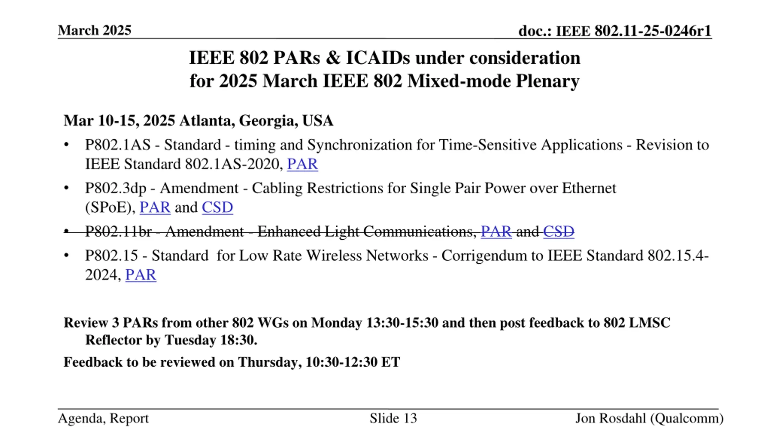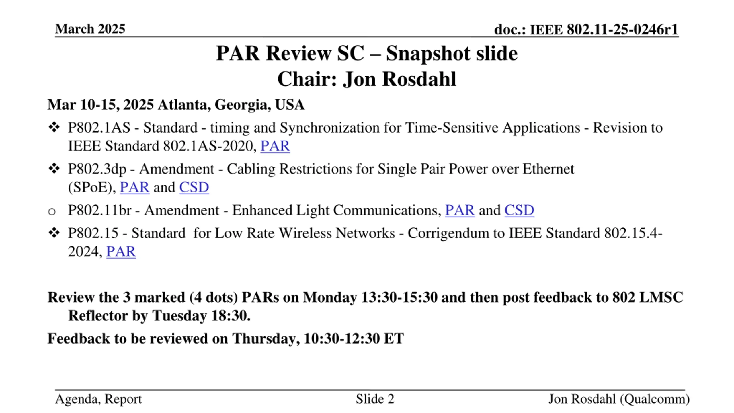 doc.: IEEE 802.11-25-0246r1 March 2025 IEEE 802 PARs & ICAIDs under consideration for 2025 March IEEE 802 Mixed-mode Plenary Mar 10-15, 2025 Atlanta, Georgia, USA P802.1AS - Standard - timing and Synchronization for Time-Sensitive Applications - Revision to IEEE Standard 802.1AS-2020, PAR P802.3dp - Amendment - Cabling Restrictions for Single Pair Power over Ethernet (SPoE), PAR and CSD P802.11br - Amendment - Enhanced Light Communications, PAR and CSD P802.15 - Standard for Low Rate Wireless Networks - Corrigendum to IEEE Standard 802.15.4- 2024, PAR Review 3 PARs from other 802 WGs on Monday 13:30-15:30 and then post feedback to 802 LMSC Reflector by Tuesday 18:30. Feedback to be reviewed on Thursday, 10:30-12:30 ET Agenda, Report Slide 13 Jon Rosdahl (Qualcomm)