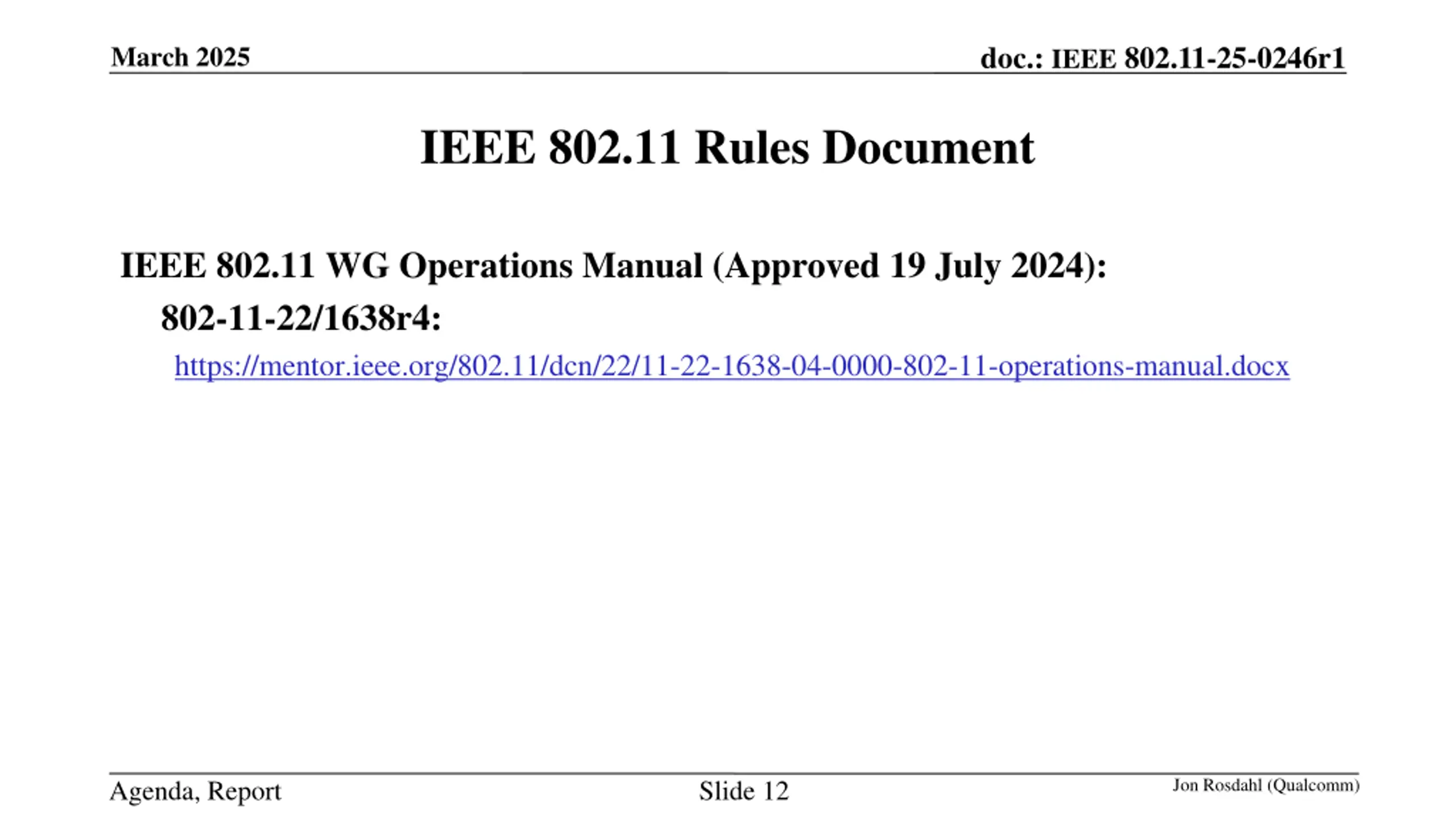 doc.: IEEE 802.11-25-0246r1 March 2025 IEEE 802.11 Rules Document IEEE 802.11 WG Operations Manual (Approved 19 July 2024): 802-11-22/1638r4: https://mentor.ieee.org/802.11/dcn/22/11-22-1638-04-0000-802-11-operations-manual.docx Jon Rosdahl (Qualcomm) Agenda, Report Slide 12