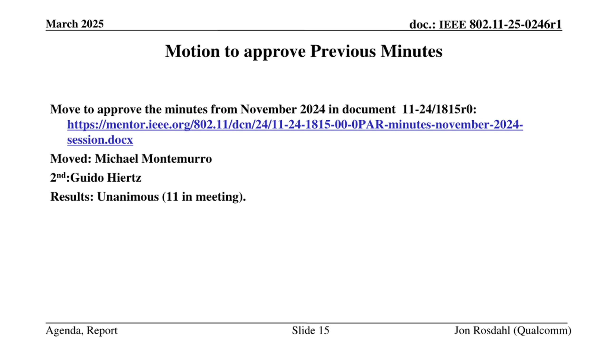 doc.: IEEE 802.11-25-0246r1 March 2025 Motion to approve Previous Minutes Move to approve the minutes from November 2024 in document 11-24/1815r0: https://mentor.ieee.org/802.11/dcn/24/11-24-1815-00-0PAR-minutes-november-2024- session.docx Moved: Michael Montemurro 2nd:Guido Hiertz Results: Unanimous (11 in meeting). Agenda, Report Slide 15 Jon Rosdahl (Qualcomm)