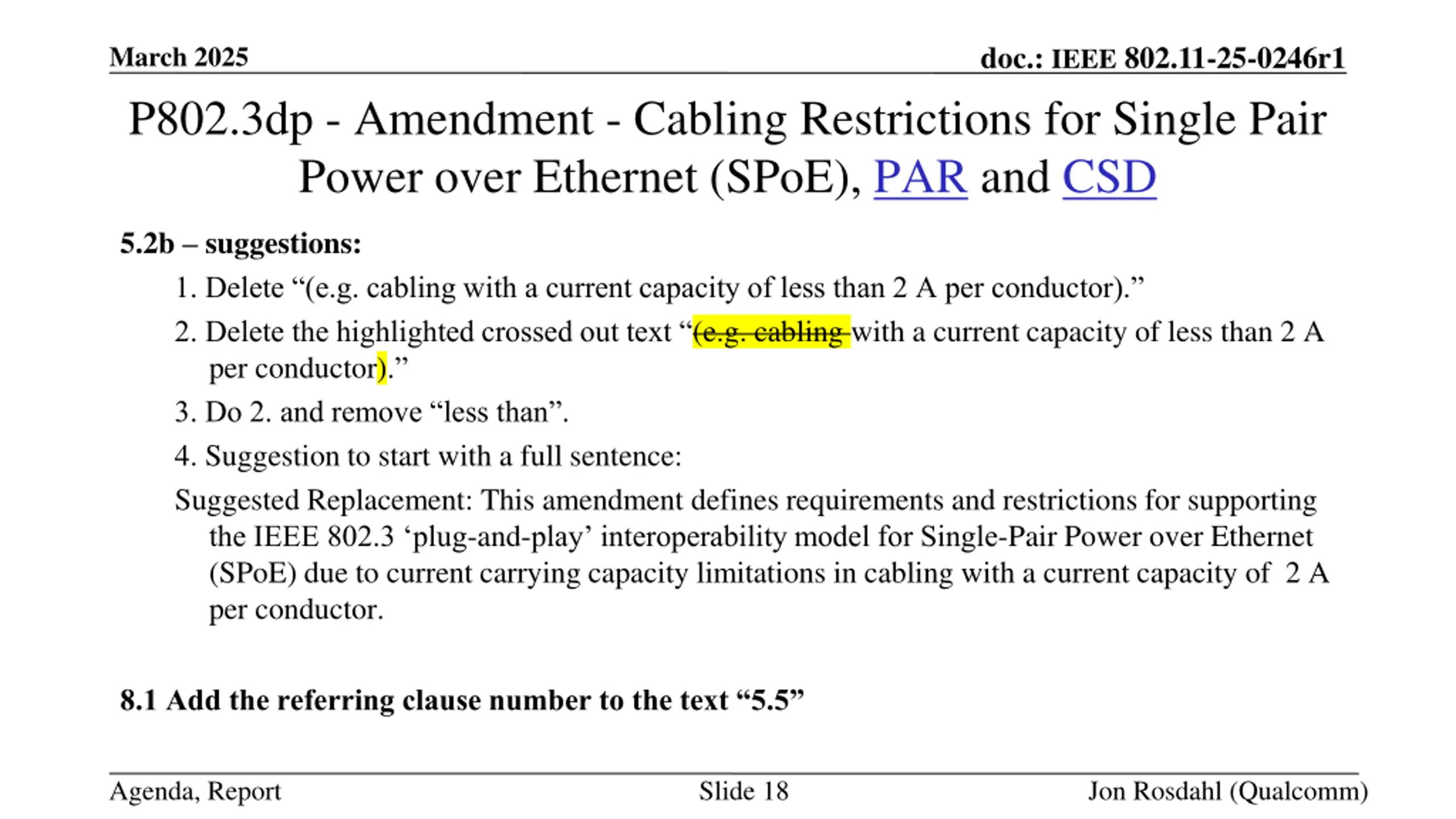 doc.: IEEE 802.11-25-0246r1 March 2025 P802.3dp - Amendment - Cabling Restrictions for Single Pair Power over Ethernet (SPoE), PAR and CSD 5.2b suggestions: 1. Delete (e.g. cabling with a current capacity of less than 2 A per conductor). 2. Delete the highlighted crossed out text (e.g. cabling with a current capacity of less than 2 A per conductor). 3. Do 2. and remove less than . 4. Suggestion to start with a full sentence: Suggested Replacement: This amendment defines requirements and restrictions for supporting the IEEE 802.3 plug-and-play interoperability model for Single-Pair Power over Ethernet (SPoE) due to current carrying capacity limitations in cabling with a current capacity of 2 A per conductor. 8.1 Add the referring clause number to the text 5.5 Agenda, Report Slide 18 Jon Rosdahl (Qualcomm)