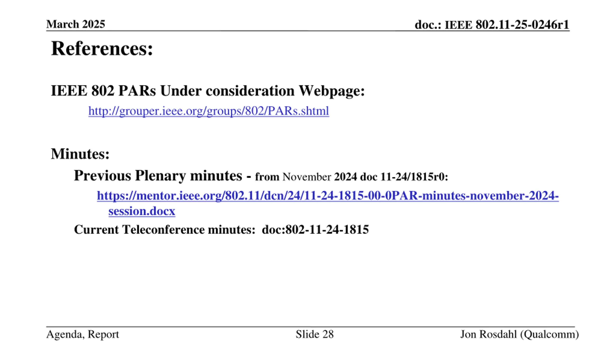 doc.: IEEE 802.11-25-0246r1 March 2025 References: IEEE 802 PARs Under consideration Webpage: http://grouper.ieee.org/groups/802/PARs.shtml Minutes: Previous Plenary minutes - from November 2024 doc 11-24/1815r0: https://mentor.ieee.org/802.11/dcn/24/11-24-1815-00-0PAR-minutes-november-2024- session.docx Current Teleconference minutes: doc:802-11-24-1815 Agenda, Report Slide 28 Jon Rosdahl (Qualcomm)