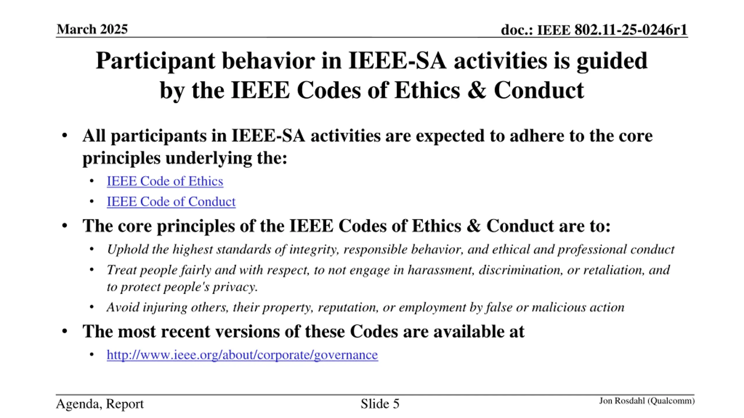 doc.: IEEE 802.11-25-0246r1 March 2025 Participant behavior in IEEE-SA activities is guided by the IEEE Codes of Ethics & Conduct All participants in IEEE-SA activities are expected to adhere to the core principles underlying the: IEEE Code of Ethics IEEE Code of Conduct The core principles of the IEEE Codes of Ethics & Conduct are to: Uphold the highest standards of integrity, responsible behavior, and ethical and professional conduct Treat people fairly and with respect, to not engage in harassment, discrimination, or retaliation, and to protect people's privacy. Avoid injuring others, their property, reputation, or employment by false or malicious action The most recent versions of these Codes are available at http://www.ieee.org/about/corporate/governance Jon Rosdahl (Qualcomm) Agenda, Report Slide 5