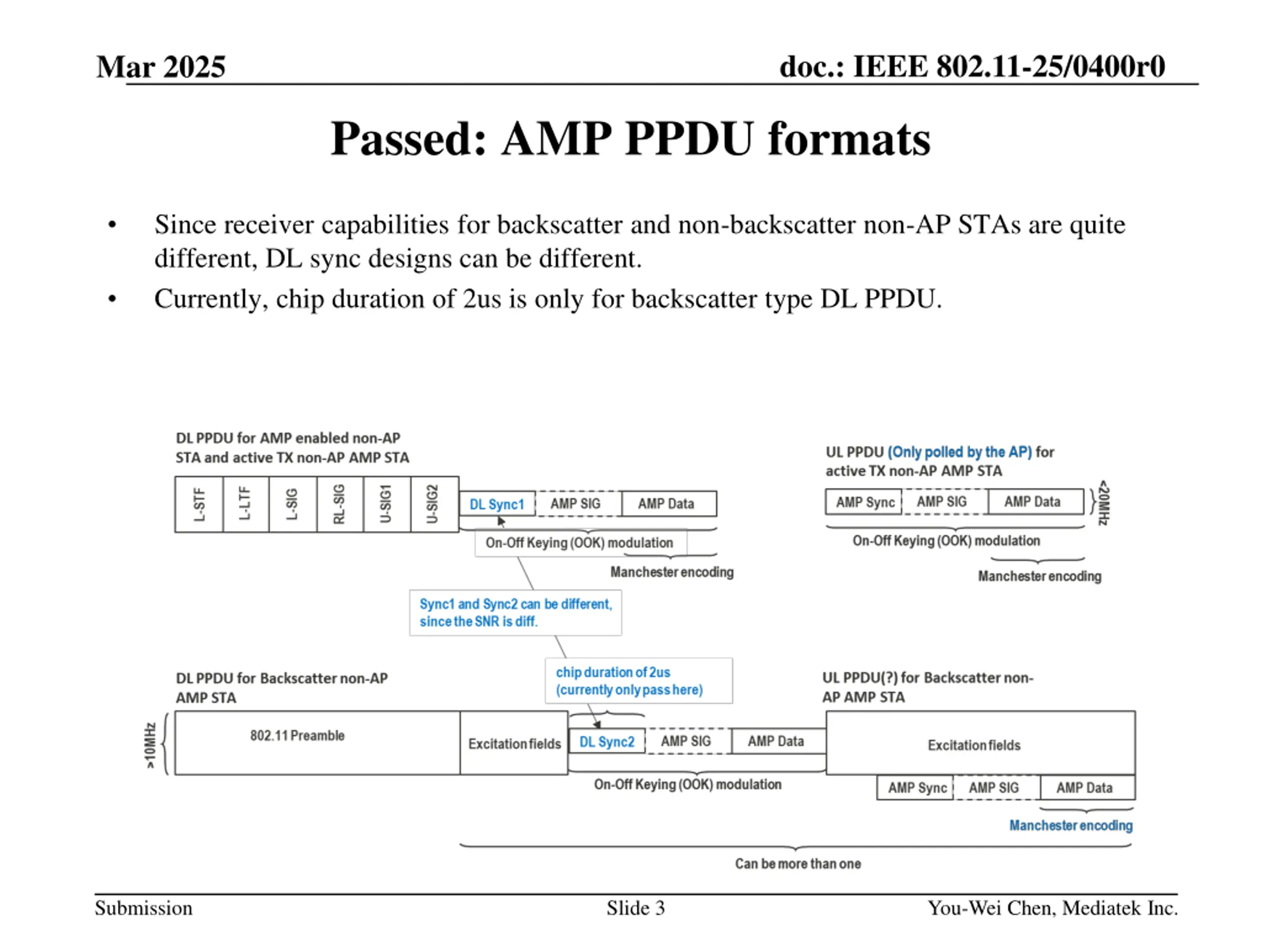 doc.: IEEE 802.11-25/0400r0 Mar 2025 References [1] 11-25/27, AMP PPDU Design, Yinan Qi et al., OPPO [2] 11-25/34, Sync field for AMP PPDU, Wang Ke et al., OPPO [3] 11-25/42, AMP Downlink Sync Field Study, Steve Shellhammer et al., Qualcomm. [4] 11-25/47, Follow up on Downlink Sync Field Design, Bin Qian et al., Huawei. [5] 11-25/48, Discussion on Uplink Transmissions for Backscatter STAs, Bin Qian et al., Huawei [6] 11-25/75, Further Thoughts on AMP DL PPDU for Mono-static Backscattering, Rui Cao et al., NXP [7] 11-24/1322, IEEE 802.11 TGbp Motion Dock Submission Slide 9 You-Wei Chen, Mediatek Inc.