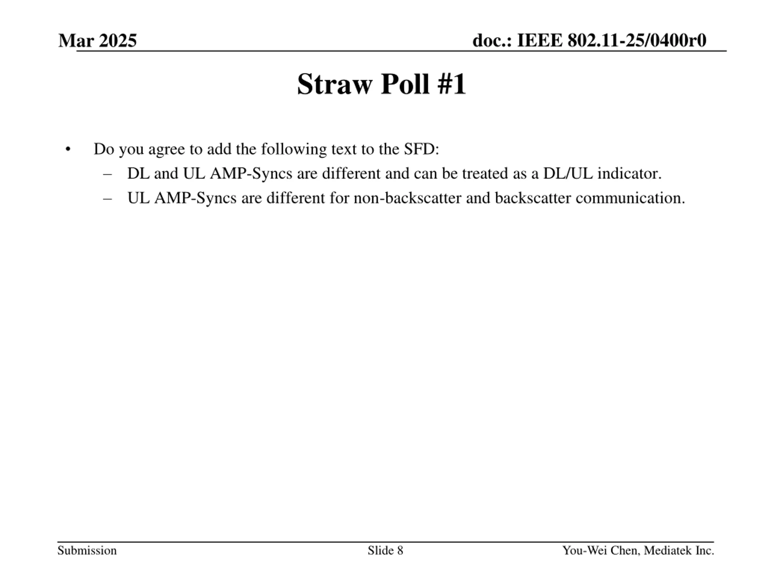 doc.: IEEE 802.11-25/0400r0 Mar 2025 Straw Poll #1 Do you agree to add the following text to the SFD: DL and UL AMP-Syncs are different and can be treated as a DL/UL indicator. UL AMP-Syncs are different for non-backscatter and backscatter communication. Submission Slide 8 You-Wei Chen, Mediatek Inc.