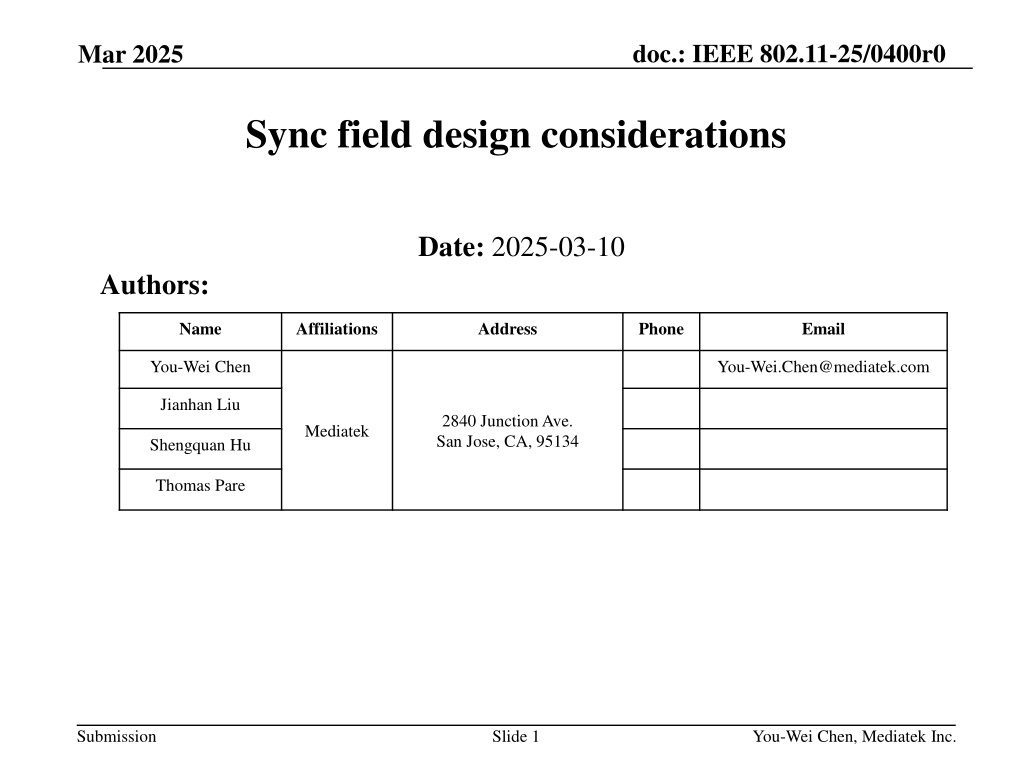 doc.: IEEE 802.11-25/0400r0 Mar 2025 Sync field design considerations Date: 2025-03-10 Authors: Name Affiliations Address Phone Email You-Wei Chen You-Wei.Chen@mediatek.com Jianhan Liu 2840 Junction Ave. San Jose, CA, 95134 Mediatek Shengquan Hu Thomas Pare Submission Slide 1 You-Wei Chen, Mediatek Inc.