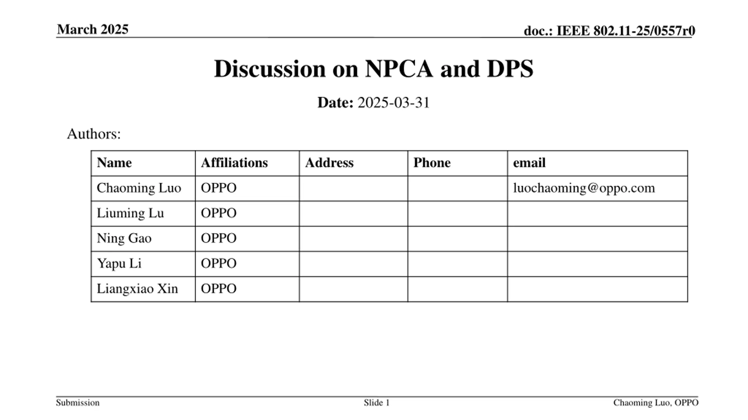 March 2025 doc.: IEEE 802.11-25/0557r0 Discussion on NPCA and DPS Date: 2025-03-31 Authors: Name Affiliations Address Phone email Chaoming Luo OPPO luochaoming@oppo.com Liuming Lu OPPO Ning Gao OPPO Yapu Li OPPO Liangxiao Xin OPPO Submission Slide 1 Chaoming Luo, OPPO