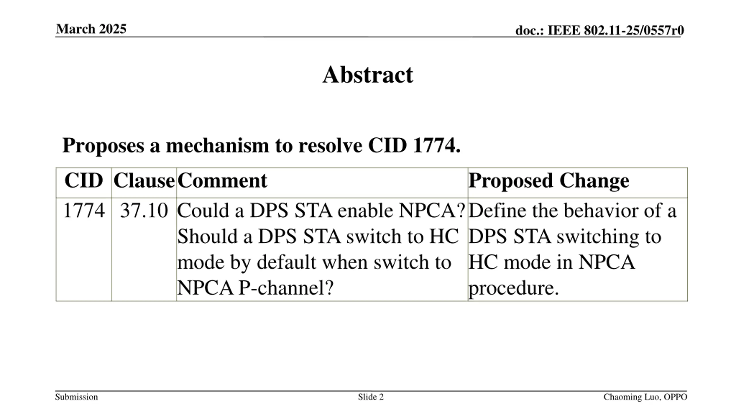 March 2025 doc.: IEEE 802.11-25/0557r0 Abstract Proposes a mechanism to resolve CID 1774. CID ClauseComment 1774 37.10 Could a DPS STA enable NPCA? Should a DPS STA switch to HC mode by default when switch to NPCA P-channel? Proposed Change Define the behavior of a DPS STA switching to HC mode in NPCA procedure. Submission Slide 2 Chaoming Luo, OPPO