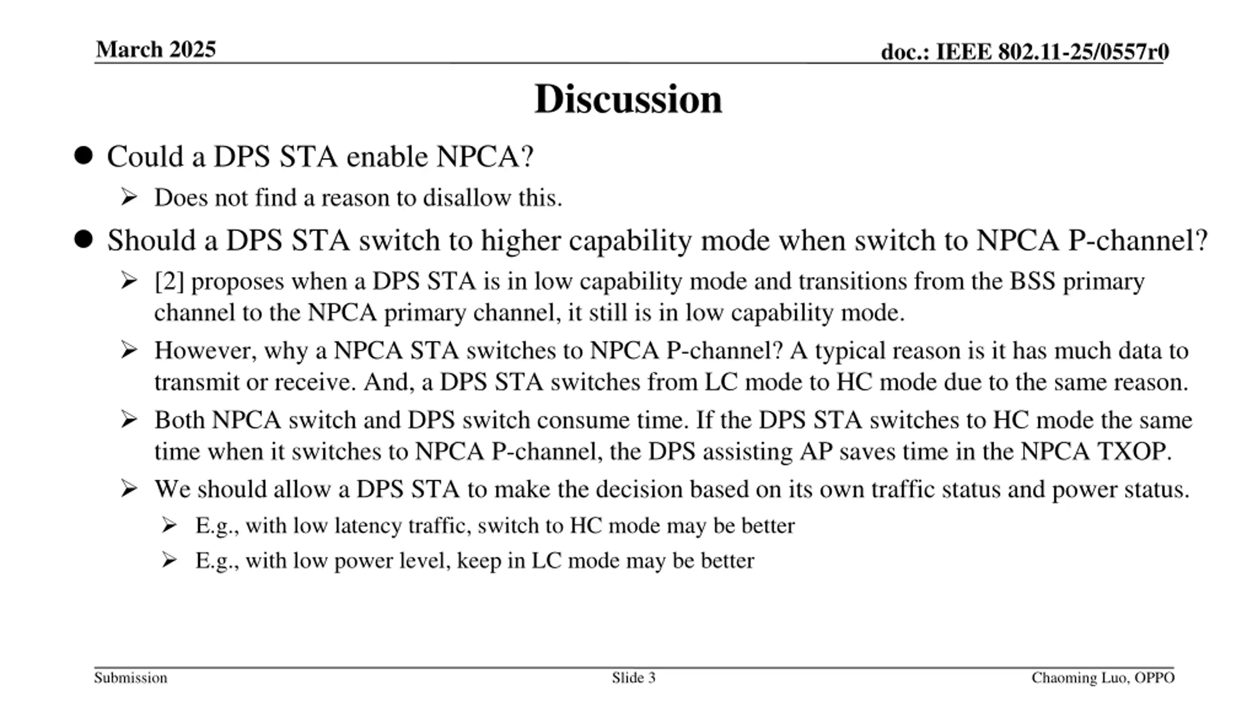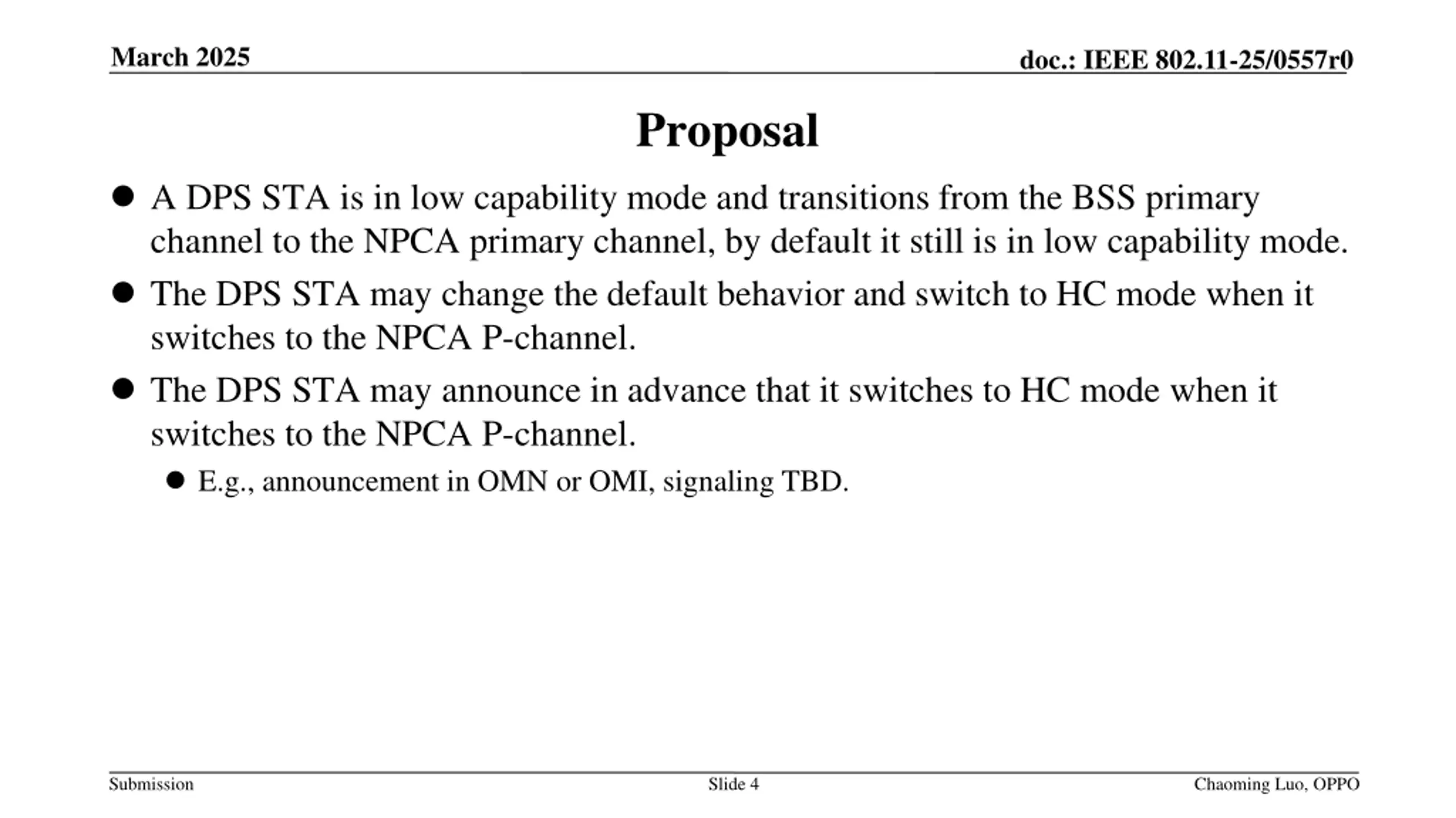 March 2025 doc.: IEEE 802.11-25/0557r0 Proposal A DPS STA is in low capability mode and transitions from the BSS primary channel to the NPCA primary channel, by default it still is in low capability mode. The DPS STA may change the default behavior and switch to HC mode when it switches to the NPCA P-channel. The DPS STA may announce in advance that it switches to HC mode when it switches to the NPCA P-channel. E.g., announcement in OMN or OMI, signaling TBD. Submission Slide 4 Chaoming Luo, OPPO