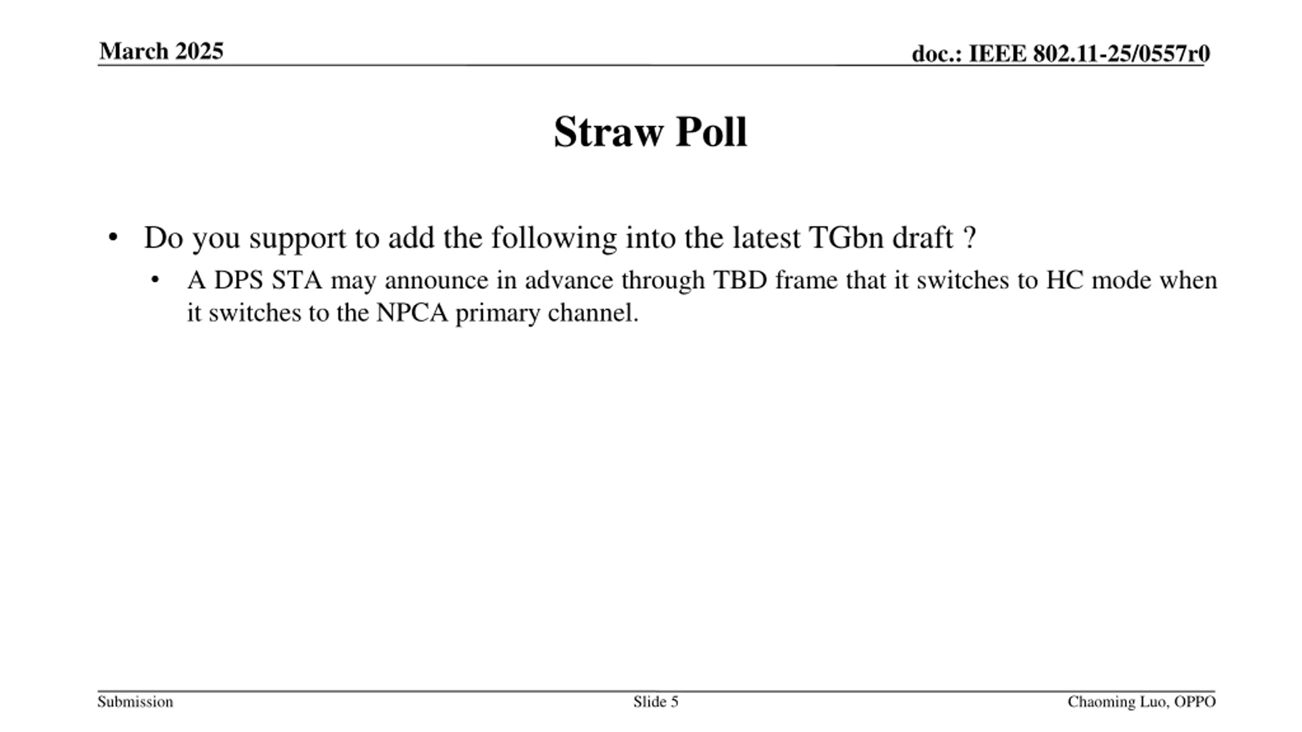 March 2025 doc.: IEEE 802.11-25/0557r0 Straw Poll Do you support to add the following into the latest TGbn draft ? A DPS STA may announce in advance through TBD frame that it switches to HC mode when it switches to the NPCA primary channel. Submission Slide 5 Chaoming Luo, OPPO