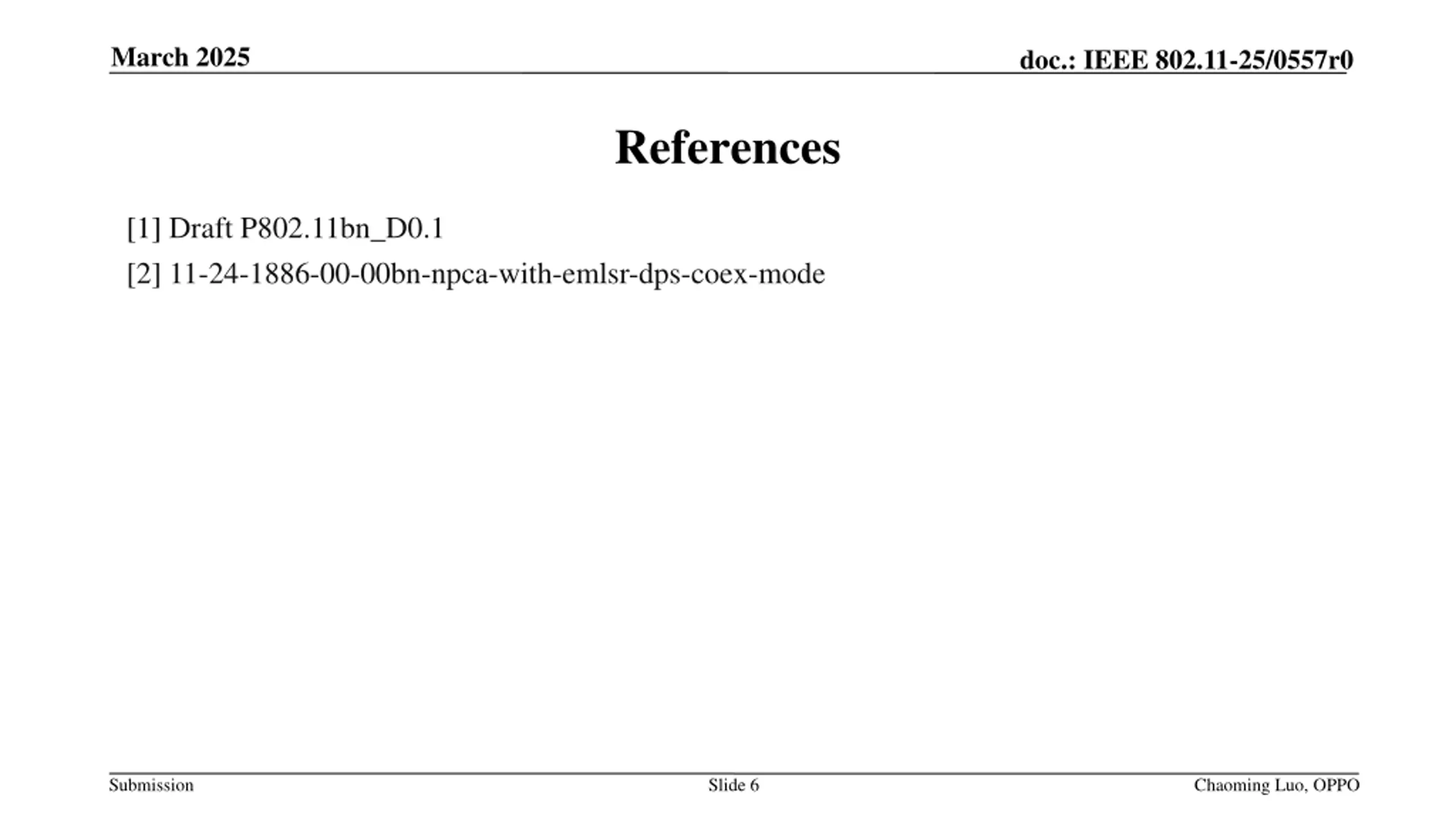 March 2025 doc.: IEEE 802.11-25/0557r0 References [1] Draft P802.11bn_D0.1 [2] 11-24-1886-00-00bn-npca-with-emlsr-dps-coex-mode Submission Slide 6 Chaoming Luo, OPPO