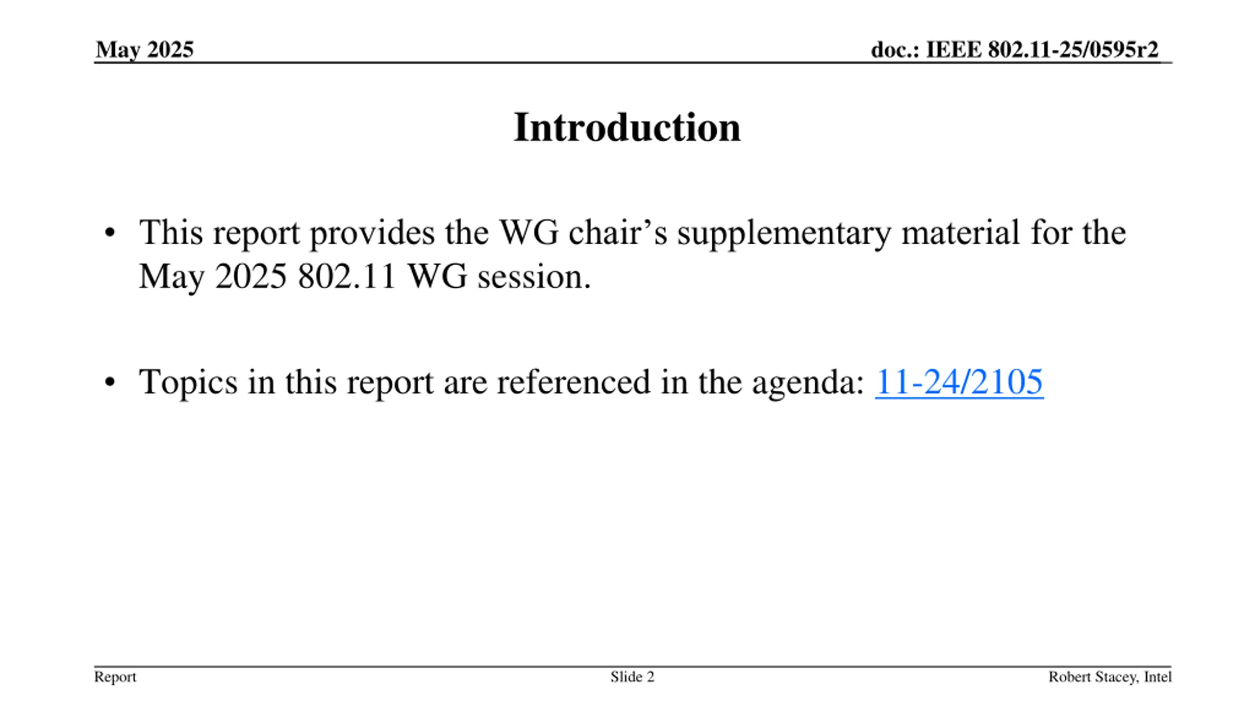 May 2025 doc.: IEEE 802.11-25/0595r2 Introduction This report provides the WG chair s supplementary material for the May 2025 802.11 WG session. Topics in this report are referenced in the agenda: 11-24/2105 Report Slide 2 Robert Stacey, Intel