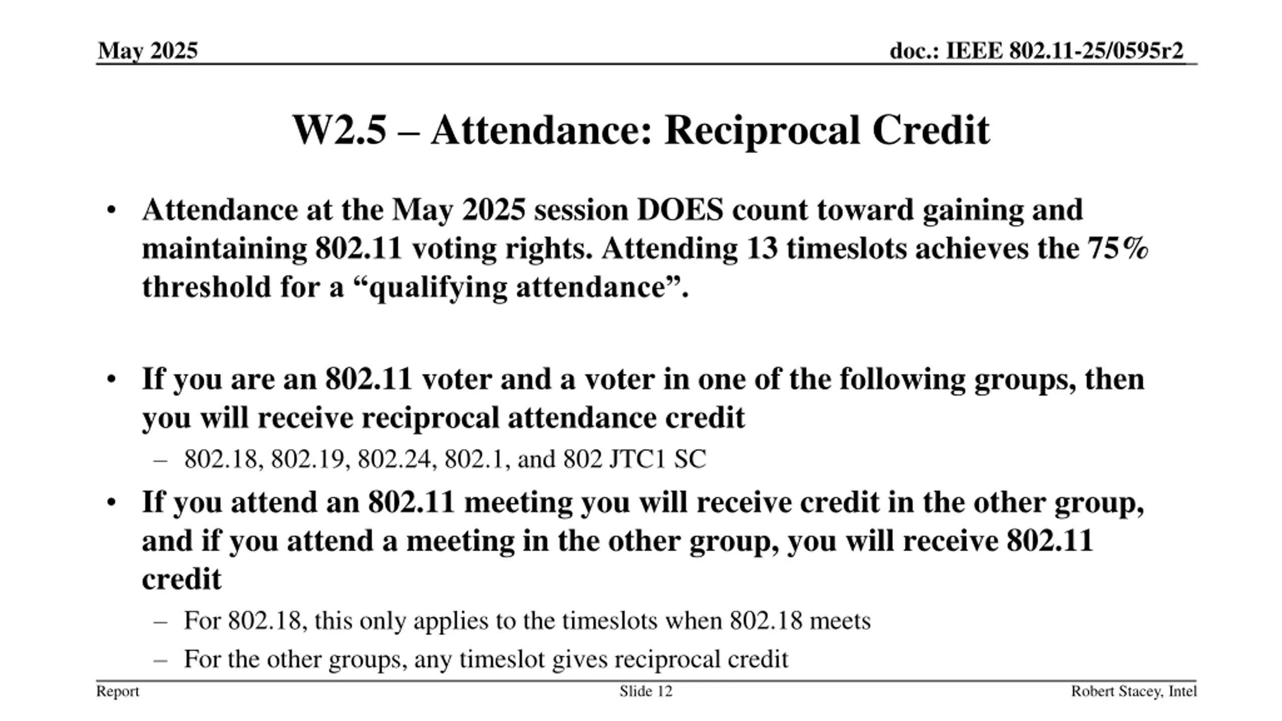 May 2025 doc.: IEEE 802.11-25/0595r2 W2.5 Attendance: Reciprocal Credit Attendance at the May 2025 session DOES count toward gaining and maintaining 802.11 voting rights. Attending 13 timeslots achieves the 75% threshold for a qualifying attendance . If you are an 802.11 voter and a voter in one of the following groups, then you will receive reciprocal attendance credit 802.18, 802.19, 802.24, 802.1, and 802 JTC1 SC If you attend an 802.11 meeting you will receive credit in the other group, and if you attend a meeting in the other group, you will receive 802.11 credit For 802.18, this only applies to the timeslots when 802.18 meets For the other groups, any timeslot gives reciprocal credit Report Slide 12 Robert Stacey, Intel