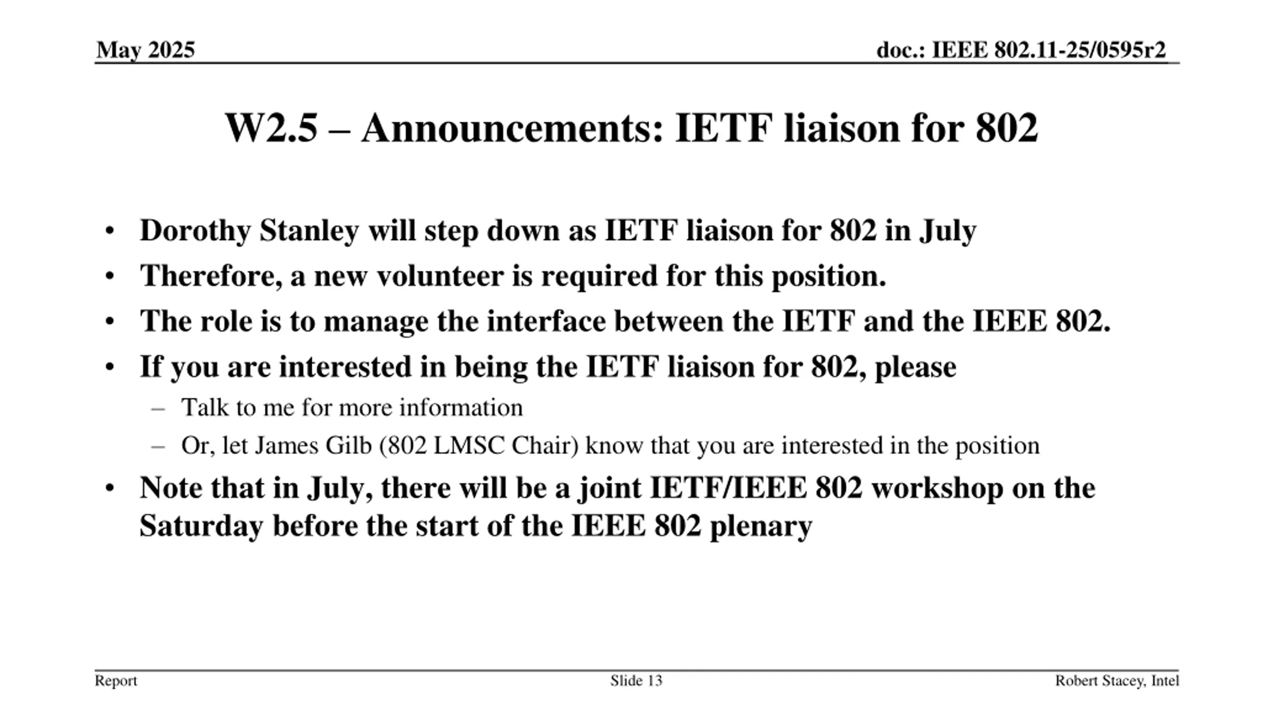 May 2025 doc.: IEEE 802.11-25/0595r2 W2.5 Announcements: IETF liaison for 802 Dorothy Stanley will step down as IETF liaison for 802 in July Therefore, a new volunteer is required for this position. The role is to manage the interface between the IETF and the IEEE 802. If you are interested in being the IETF liaison for 802, please Talk to me for more information Or, let James Gilb (802 LMSC Chair) know that you are interested in the position Note that in July, there will be a joint IETF/IEEE 802 workshop on the Saturday before the start of the IEEE 802 plenary Report Slide 13 Robert Stacey, Intel