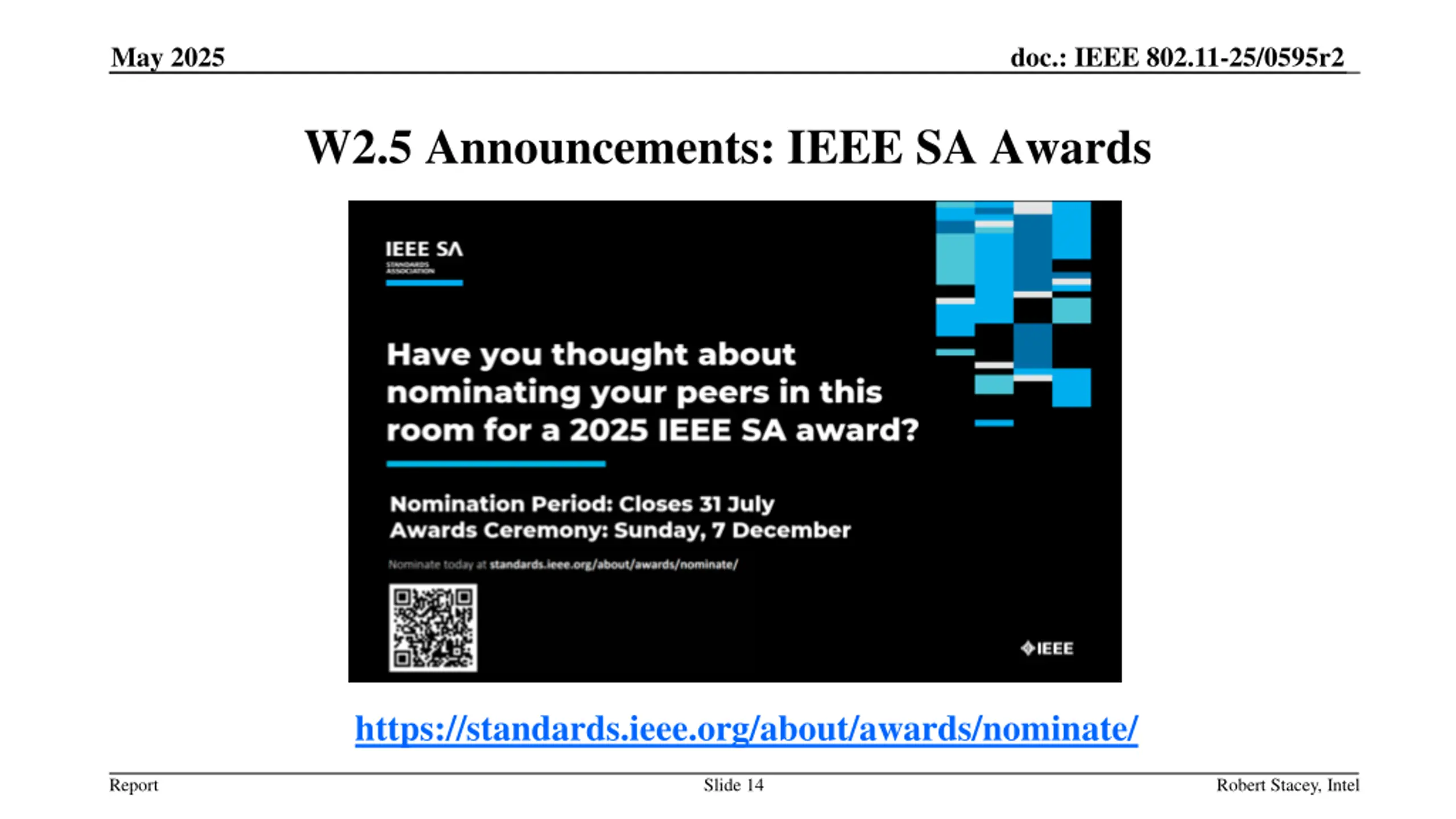 May 2025 doc.: IEEE 802.11-25/0595r2 W2.5 Announcements: IEEE SA Awards https://standards.ieee.org/about/awards/nominate/ Report Slide 14 Robert Stacey, Intel
