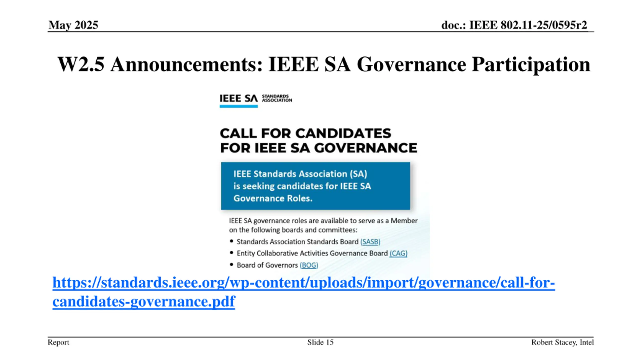 May 2025 doc.: IEEE 802.11-25/0595r2 W2.5 Announcements: IEEE SA Governance Participation https://standards.ieee.org/wp-content/uploads/import/governance/call-for- candidates-governance.pdf Report Slide 15 Robert Stacey, Intel
