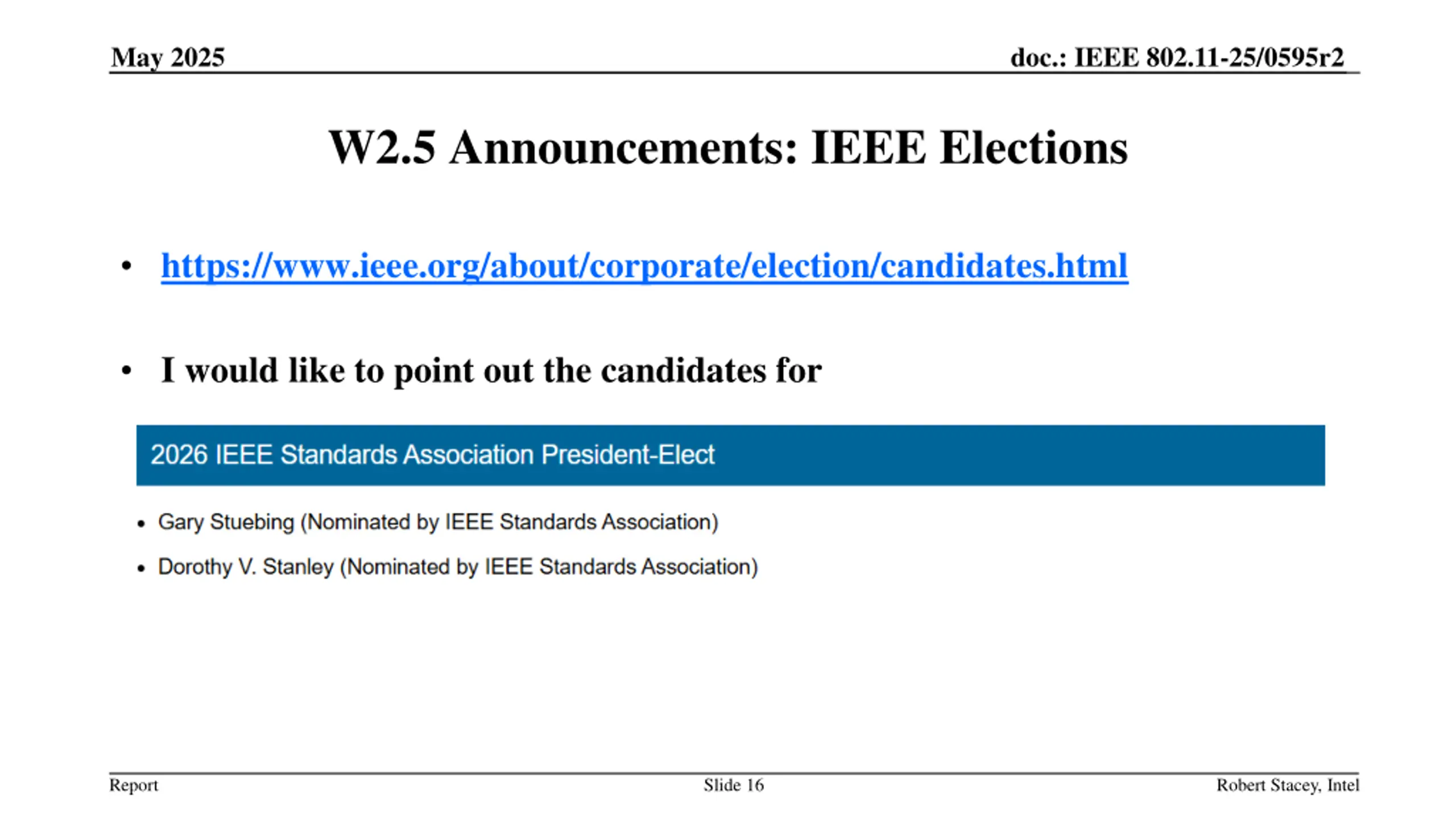 May 2025 doc.: IEEE 802.11-25/0595r2 W2.5 Announcements: IEEE Elections https://www.ieee.org/about/corporate/election/candidates.html I would like to point out the candidates for Report Slide 16 Robert Stacey, Intel