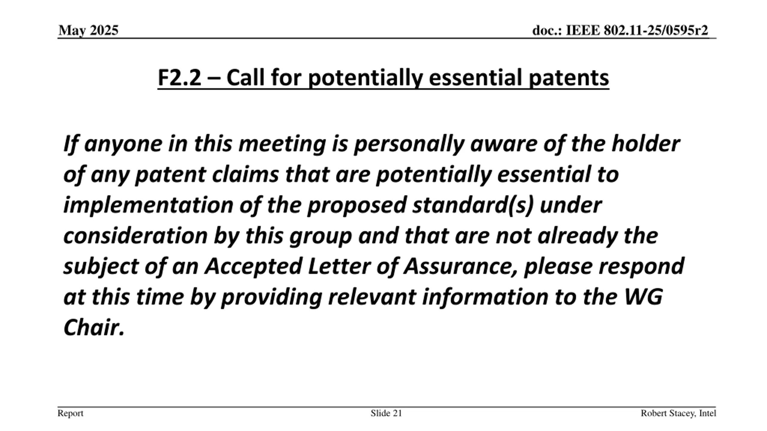 May 2025 doc.: IEEE 802.11-25/0595r2 F2.2 Call for potentially essential patents If anyone in this meeting is personally aware of the holder of any patent claims that are potentially essential to implementation of the proposed standard(s) under consideration by this group and that are not already the subject of an Accepted Letter of Assurance, please respond at this time by providing relevant information to the WG Chair. Report Slide 21 Robert Stacey, Intel