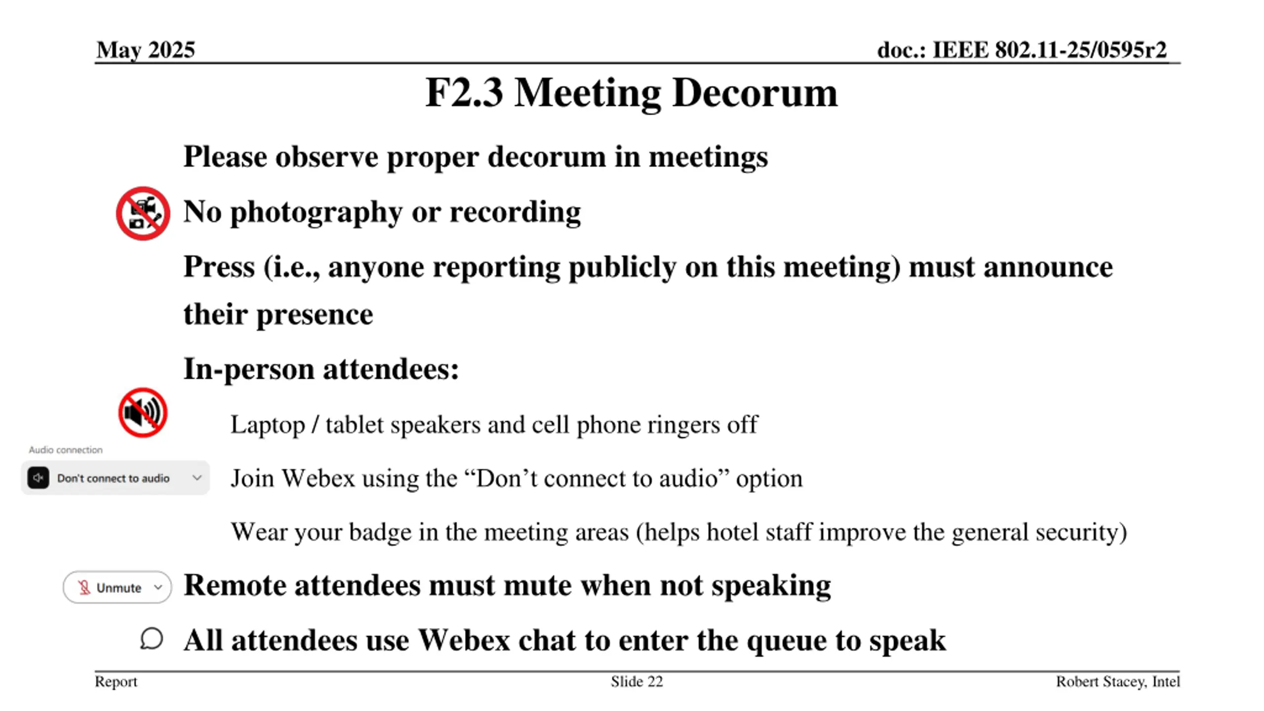 May 2025 doc.: IEEE 802.11-25/0595r2 F2.3 Meeting Decorum Please observe proper decorum in meetings No photography or recording Press (i.e., anyone reporting publicly on this meeting) must announce their presence In-person attendees: Laptop / tablet speakers and cell phone ringers off Join Webex using the Don t connect to audio option Wear your badge in the meeting areas (helps hotel staff improve the general security) Remote attendees must mute when not speaking All attendees use Webex chat to enter the queue to speak Report Slide 22 Robert Stacey, Intel
