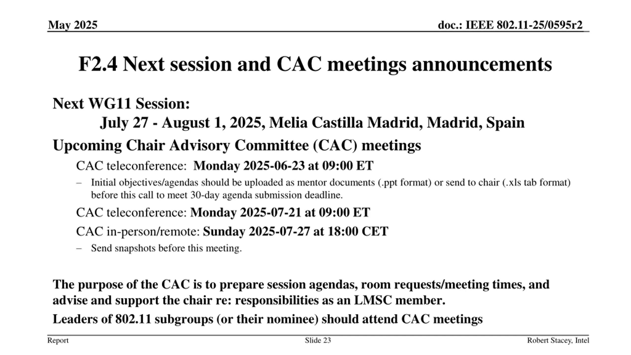May 2025 doc.: IEEE 802.11-25/0595r2 F2.4 Next session and CAC meetings announcements Next WG11 Session: July 27 - August 1, 2025, Melia Castilla Madrid, Madrid, Spain Upcoming Chair Advisory Committee (CAC) meetings CAC teleconference: Monday 2025-06-23 at 09:00 ET Initial objectives/agendas should be uploaded as mentor documents (.ppt format) or send to chair (.xls tab format) before this call to meet 30-day agenda submission deadline. CAC teleconference: Monday 2025-07-21 at 09:00 ET CAC in-person/remote: Sunday 2025-07-27 at 18:00 CET Send snapshots before this meeting. The purpose of the CAC is to prepare session agendas, room requests/meeting times, and advise and support the chair re: responsibilities as an LMSC member. Leaders of 802.11 subgroups (or their nominee) should attend CAC meetings Report Slide 23 Robert Stacey, Intel