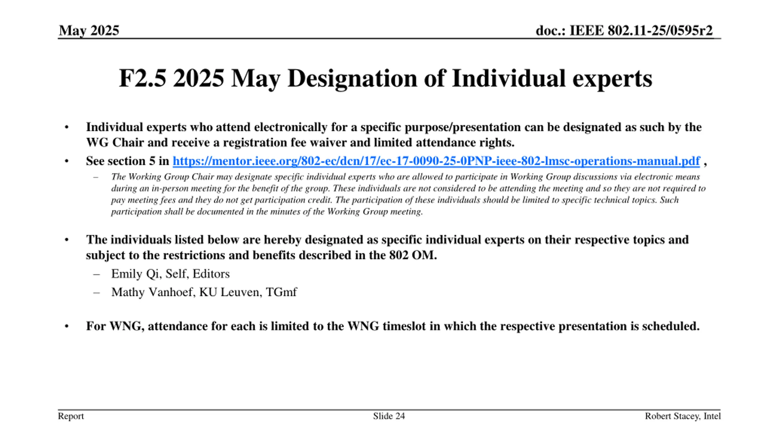 May 2025 doc.: IEEE 802.11-25/0595r2 F2.5 2025 May Designation of Individual experts Individual experts who attend electronically for a specific purpose/presentation can be designated as such by the WG Chair and receive a registration fee waiver and limited attendance rights. See section 5 in https://mentor.ieee.org/802-ec/dcn/17/ec-17-0090-25-0PNP-ieee-802-lmsc-operations-manual.pdf , The Working Group Chair may designate specific individual experts who are allowed to participate in Working Group discussions via electronic means during an in-person meeting for the benefit of the group. These individuals are not considered to be attending the meeting and so they are not required to pay meeting fees and they do not get participation credit. The participation of these individuals should be limited to specific technical topics. Such participation shall be documented in the minutes of the Working Group meeting. The individuals listed below are hereby designated as specific individual experts on their respective topics and subject to the restrictions and benefits described in the 802 OM. Emily Qi, Self, Editors Mathy Vanhoef, KU Leuven, TGmf For WNG, attendance for each is limited to the WNG timeslot in which the respective presentation is scheduled. Report Slide 24 Robert Stacey, Intel