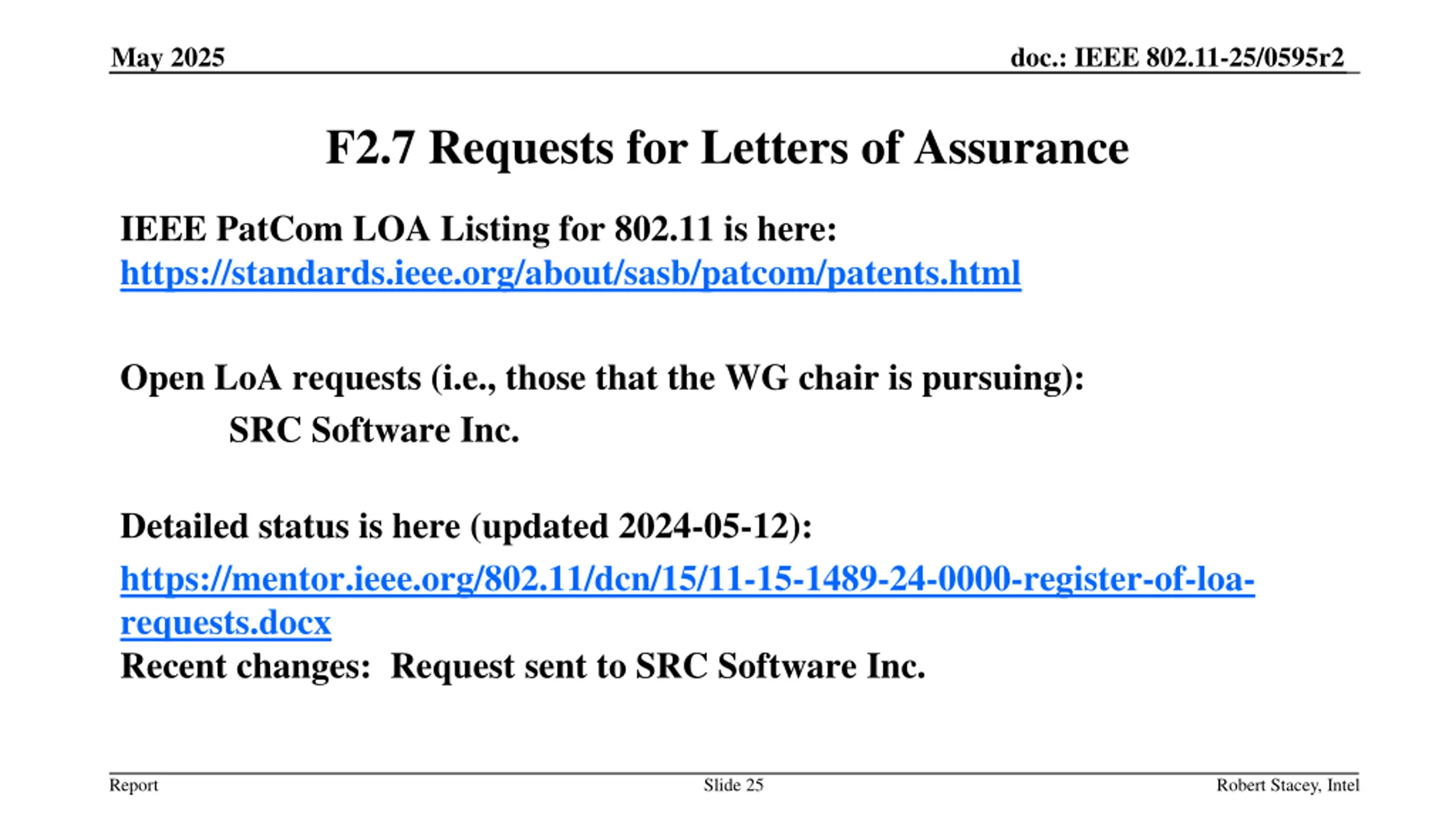 May 2025 doc.: IEEE 802.11-25/0595r2 F2.7 Requests for Letters of Assurance IEEE PatCom LOA Listing for 802.11 is here: https://standards.ieee.org/about/sasb/patcom/patents.html Open LoA requests (i.e., those that the WG chair is pursuing): SRC Software Inc. Detailed status is here (updated 2024-05-12): https://mentor.ieee.org/802.11/dcn/15/11-15-1489-24-0000-register-of-loa- requests.docx Recent changes: Request sent to SRC Software Inc. Report Slide 25 Robert Stacey, Intel