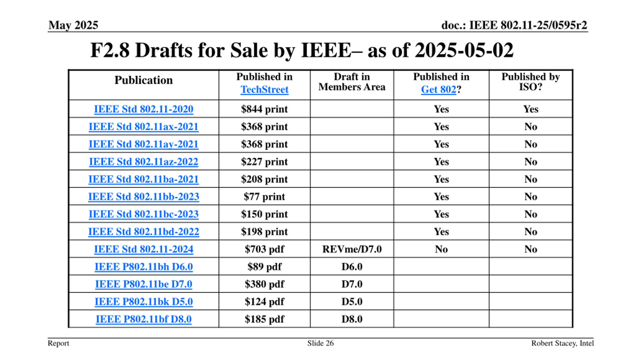 May 2025 doc.: IEEE 802.11-25/0595r2 F2.8 Drafts for Sale by IEEE as of 2025-05-02 Published in TechStreet Draft in Members Area Published in Get 802? Published by ISO? Publication IEEE Std 802.11-2020 IEEE Std 802.11ax-2021 IEEE Std 802.11ay-2021 IEEE Std 802.11az-2022 IEEE Std 802.11ba-2021 IEEE Std 802.11bb-2023 IEEE Std 802.11bc-2023 IEEE Std 802.11bd-2022 IEEE Std 802.11-2024 IEEE P802.11bh D6.0 IEEE P802.11be D7.0 IEEE P802.11bk D5.0 IEEE P802.11bf D8.0 $844 print $368 print $368 print $227 print $208 print $77 print $150 print $198 print $703 pdf $89 pdf $380 pdf $124 pdf $185 pdf Yes Yes Yes Yes Yes Yes Yes Yes No Yes No No No No No No No No REVme/D7.0 D6.0 D7.0 D5.0 D8.0 Report Slide 26 Robert Stacey, Intel