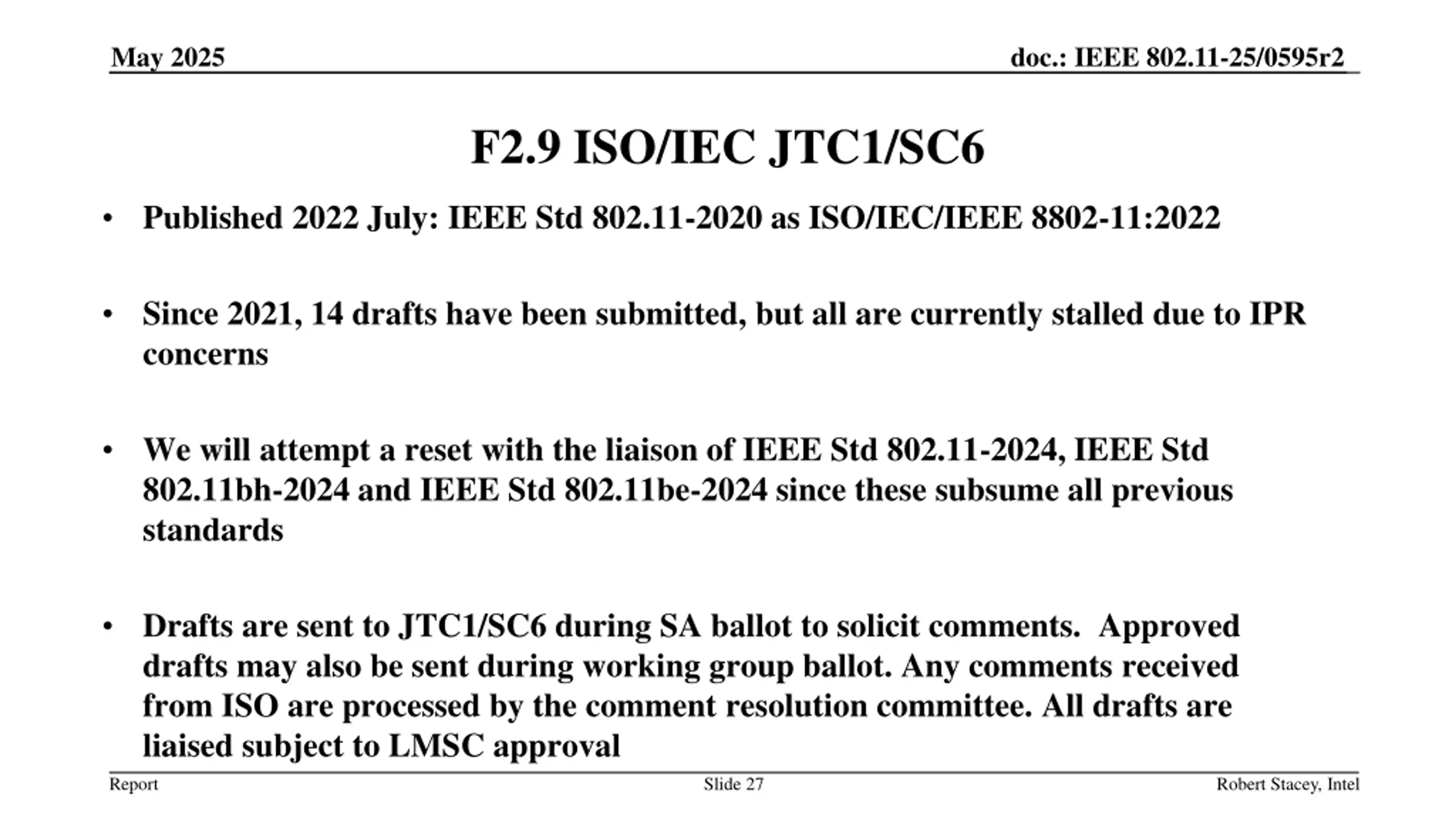 May 2025 doc.: IEEE 802.11-25/0595r2 F2.9 ISO/IEC JTC1/SC6 Published 2022 July: IEEE Std 802.11-2020 as ISO/IEC/IEEE 8802-11:2022 Since 2021, 14 drafts have been submitted, but all are currently stalled due to IPR concerns We will attempt a reset with the liaison of IEEE Std 802.11-2024, IEEE Std 802.11bh-2024 and IEEE Std 802.11be-2024 since these subsume all previous standards Drafts are sent to JTC1/SC6 during SA ballot to solicit comments. Approved drafts may also be sent during working group ballot. Any comments received from ISO are processed by the comment resolution committee. All drafts are liaised subject to LMSC approval Report Slide 27 Robert Stacey, Intel