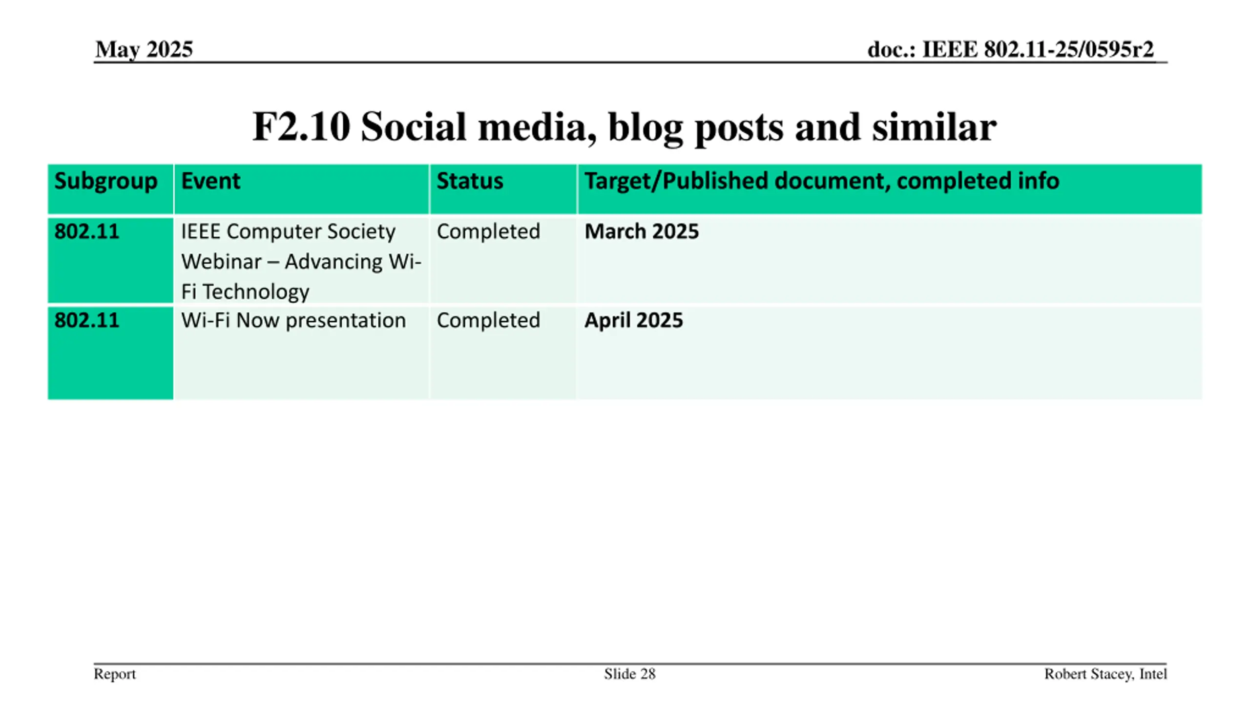 May 2025 doc.: IEEE 802.11-25/0595r2 F2.10 Social media, blog posts and similar Subgroup Event Status Target/Published document, completed info 802.11 IEEE Computer Society Webinar Advancing Wi- Fi Technology Wi-Fi Now presentation Completed March 2025 802.11 Completed April 2025 Report Slide 28 Robert Stacey, Intel
