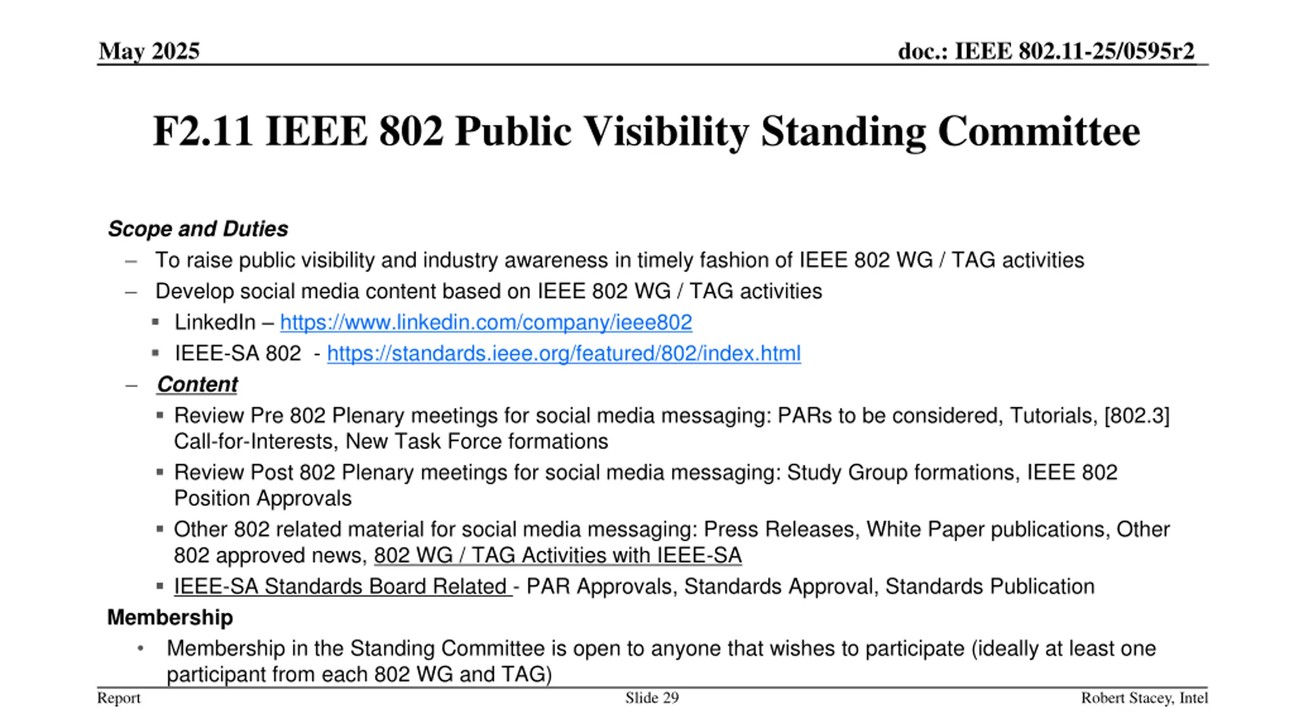 May 2025 doc.: IEEE 802.11-25/0595r2 F2.11 IEEE 802 Public Visibility Standing Committee Scope and Duties To raise public visibility and industry awareness in timely fashion of IEEE 802 WG / TAG activities Develop social media content based on IEEE 802 WG / TAG activities LinkedIn https://www.linkedin.com/company/ieee802 IEEE-SA 802 - https://standards.ieee.org/featured/802/index.html Content Review Pre 802 Plenary meetings for social media messaging: PARs to be considered, Tutorials, [802.3] Call-for-Interests, New Task Force formations Review Post 802 Plenary meetings for social media messaging: Study Group formations, IEEE 802 Position Approvals Other 802 related material for social media messaging: Press Releases, White Paper publications, Other 802 approved news, 802 WG / TAG Activities with IEEE-SA IEEE-SA Standards Board Related - PAR Approvals, Standards Approval, Standards Publication Membership Membership in the Standing Committee is open to anyone that wishes to participate (ideally at least one participant from each 802 WG and TAG) Report Slide 29 Robert Stacey, Intel