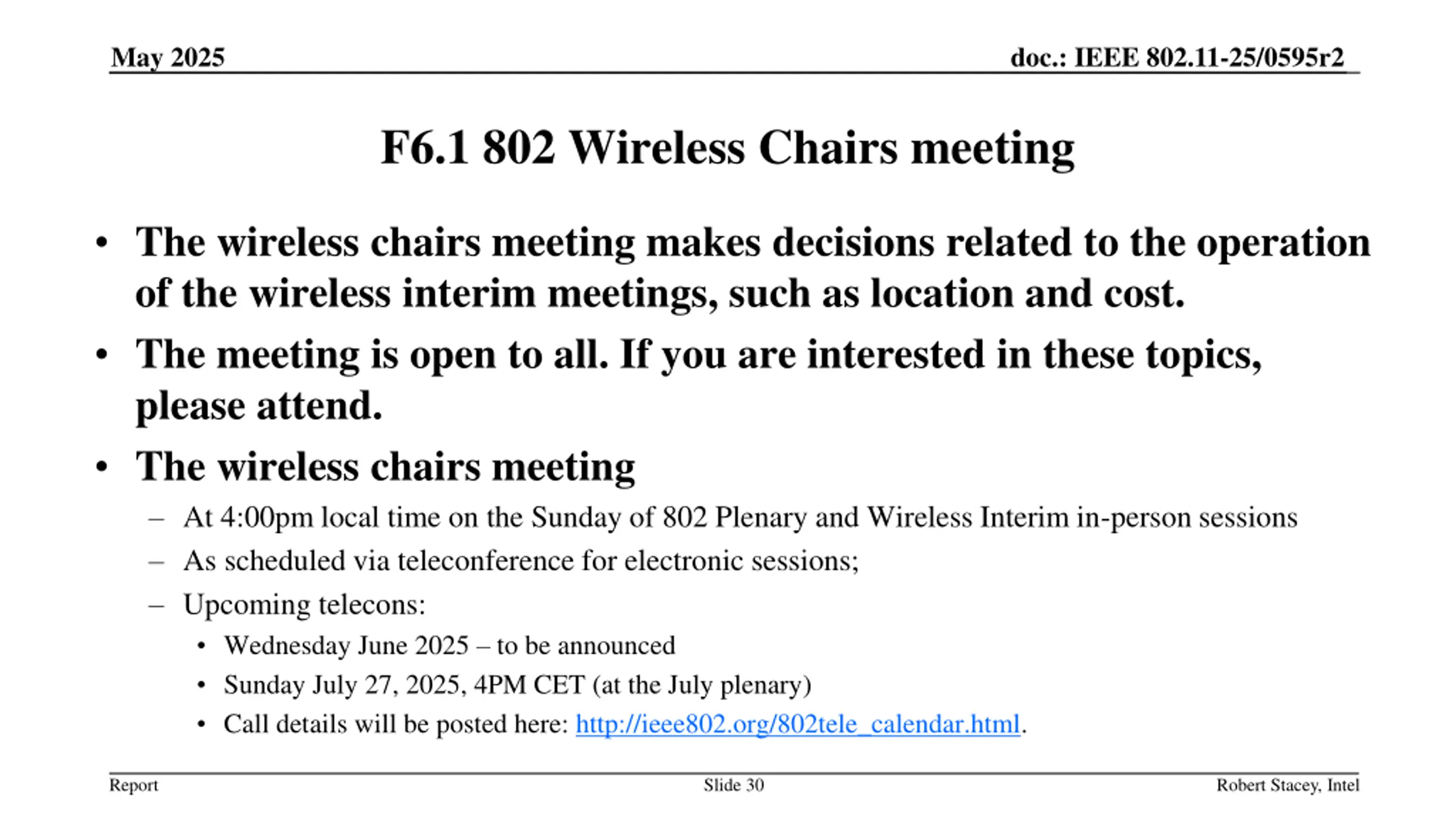 May 2025 doc.: IEEE 802.11-25/0595r2 F6.1 802 Wireless Chairs meeting The wireless chairs meeting makes decisions related to the operation of the wireless interim meetings, such as location and cost. The meeting is open to all. If you are interested in these topics, please attend. The wireless chairs meeting At 4:00pm local time on the Sunday of 802 Plenary and Wireless Interim in-person sessions As scheduled via teleconference for electronic sessions; Upcoming telecons: Wednesday June 2025 to be announced Sunday July 27, 2025, 4PM CET (at the July plenary) Call details will be posted here: http://ieee802.org/802tele_calendar.html. Report Slide 30 Robert Stacey, Intel