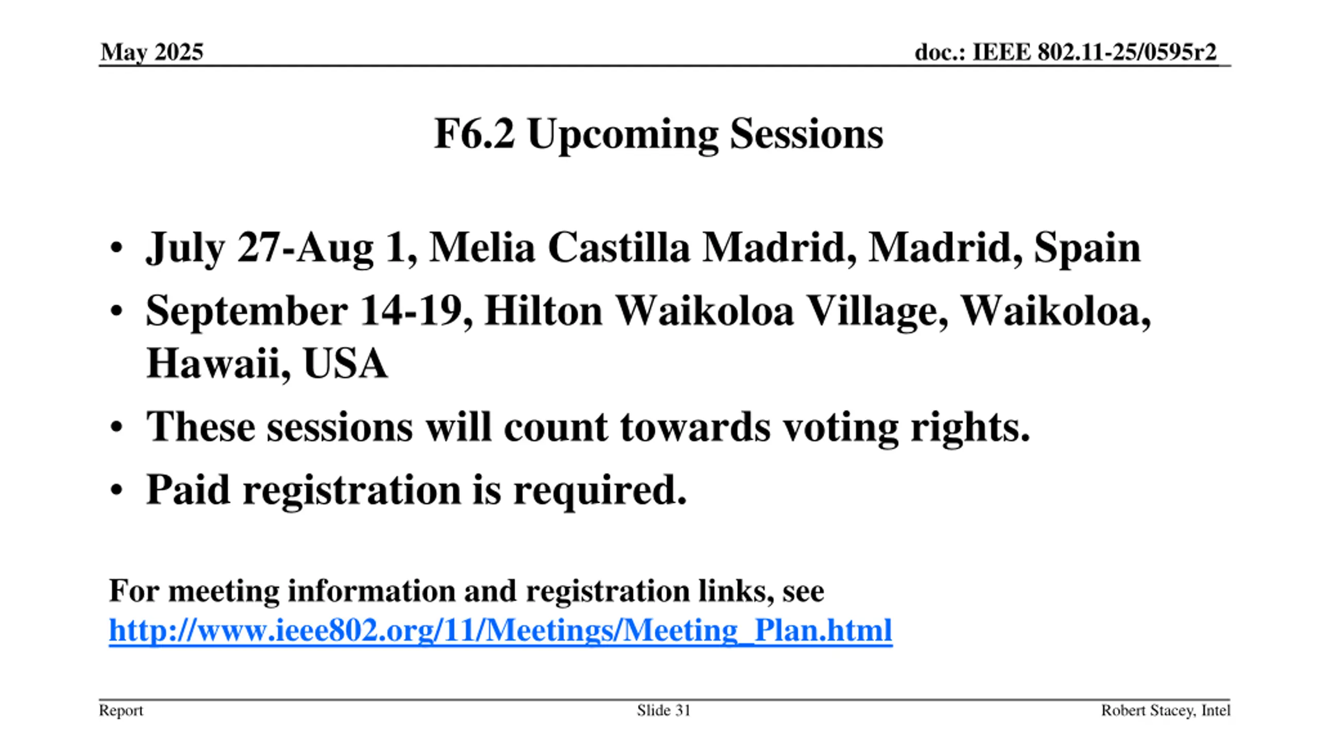 May 2025 doc.: IEEE 802.11-25/0595r2 F6.2 Upcoming Sessions July 27-Aug 1, Melia Castilla Madrid, Madrid, Spain September 14-19, Hilton Waikoloa Village, Waikoloa, Hawaii, USA These sessions will count towards voting rights. Paid registration is required. For meeting information and registration links, see http://www.ieee802.org/11/Meetings/Meeting_Plan.html Report Slide 31 Robert Stacey, Intel