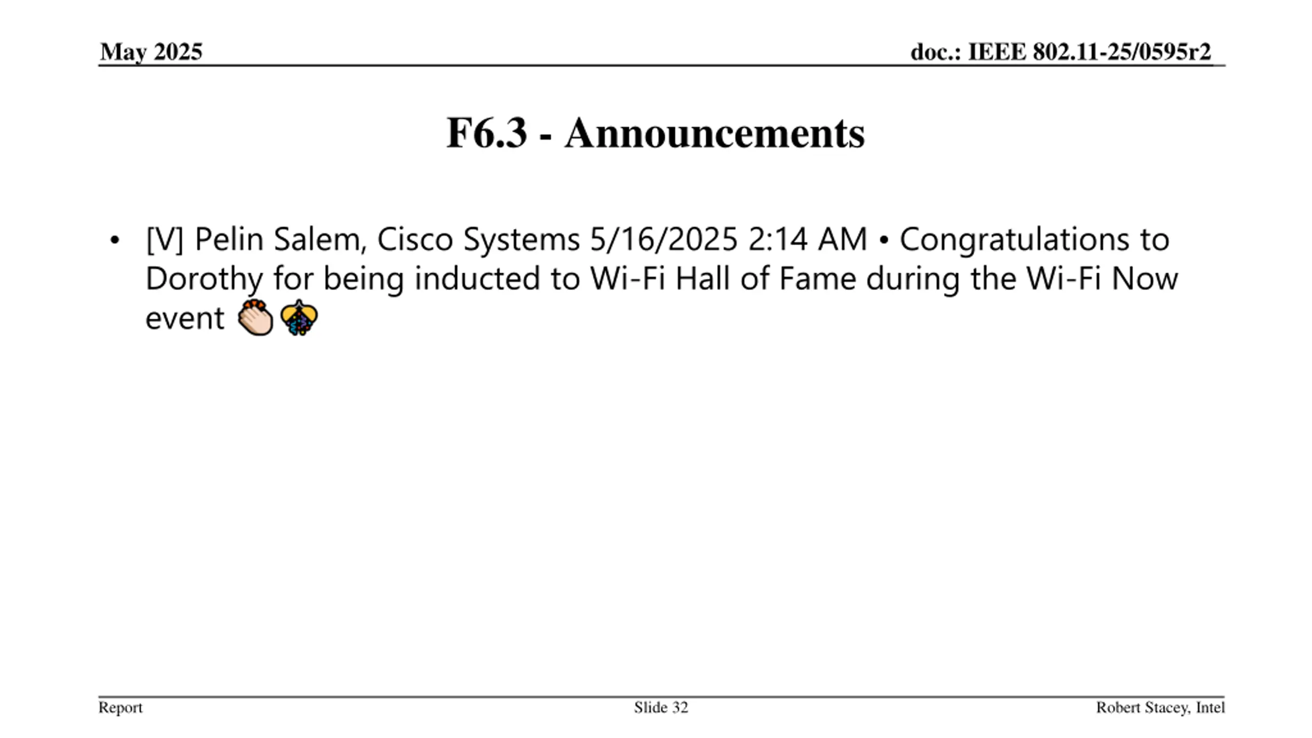 May 2025 doc.: IEEE 802.11-25/0595r2 F6.3 - Announcements [V] Pelin Salem, Cisco Systems 5/16/2025 2:14 AM Congratulations to Dorothy for being inducted to Wi-Fi Hall of Fame during the Wi-Fi Now event Report Slide 32 Robert Stacey, Intel