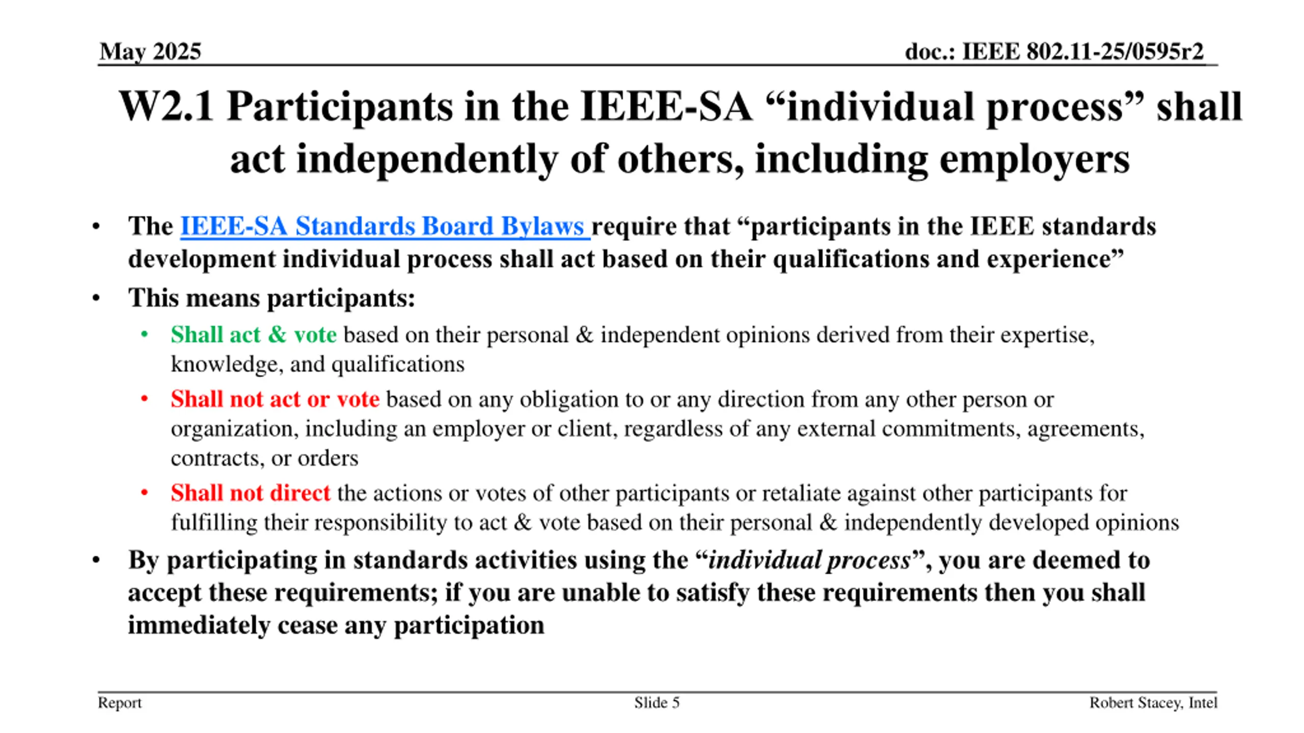 May 2025 doc.: IEEE 802.11-25/0595r2 W2.1 Participants in the IEEE-SA individual process shall act independently of others, including employers The IEEE-SA Standards Board Bylaws require that participants in the IEEE standards development individual process shall act based on their qualifications and experience This means participants: Shall act & vote based on their personal & independent opinions derived from their expertise, knowledge, and qualifications Shall not act or vote based on any obligation to or any direction from any other person or organization, including an employer or client, regardless of any external commitments, agreements, contracts, or orders Shall not direct the actions or votes of other participants or retaliate against other participants for fulfilling their responsibility to act & vote based on their personal & independently developed opinions By participating in standards activities using the individual process , you are deemed to accept these requirements; if you are unable to satisfy these requirements then you shall immediately cease any participation Report Slide 5 Robert Stacey, Intel