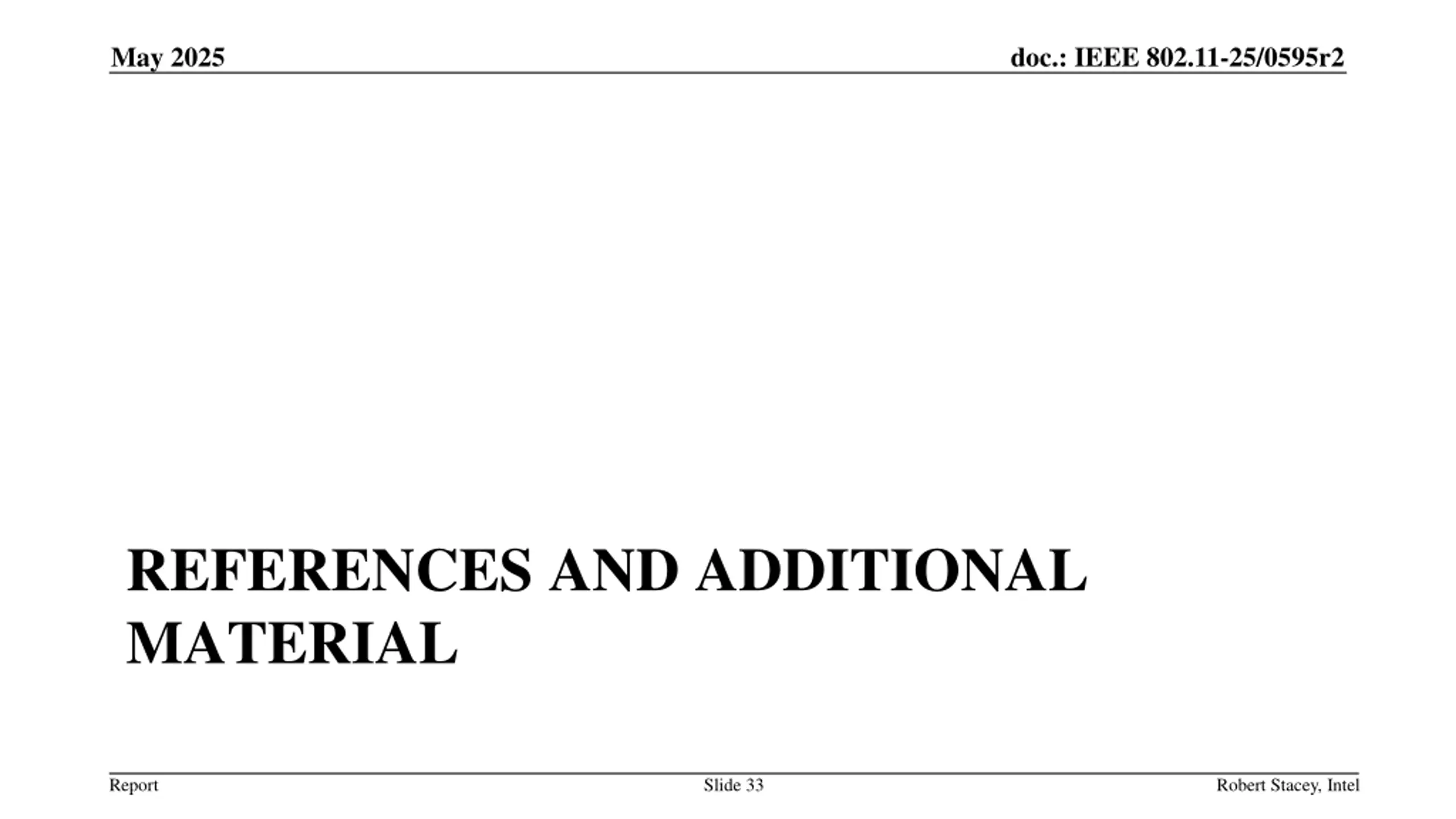 May 2025 doc.: IEEE 802.11-25/0595r2 REFERENCES AND ADDITIONAL MATERIAL Report Slide 33 Robert Stacey, Intel