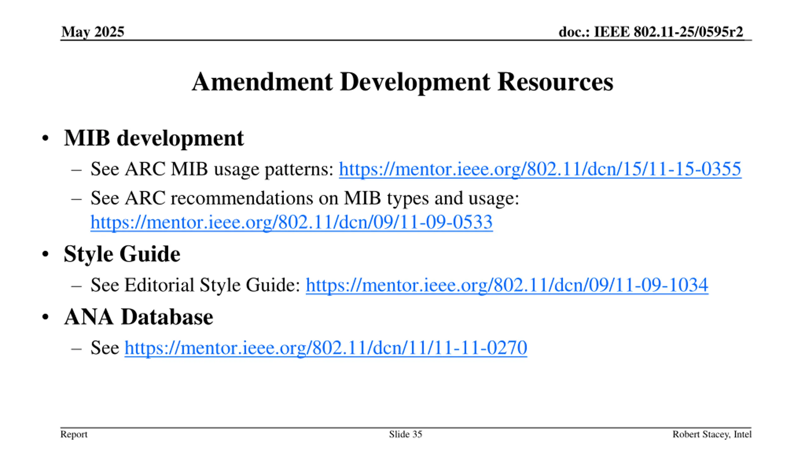 May 2025 doc.: IEEE 802.11-25/0595r2 Amendment Development Resources MIB development See ARC MIB usage patterns: https://mentor.ieee.org/802.11/dcn/15/11-15-0355 See ARC recommendations on MIB types and usage: https://mentor.ieee.org/802.11/dcn/09/11-09-0533 Style Guide See Editorial Style Guide: https://mentor.ieee.org/802.11/dcn/09/11-09-1034 ANA Database See https://mentor.ieee.org/802.11/dcn/11/11-11-0270 Report Slide 35 Robert Stacey, Intel
