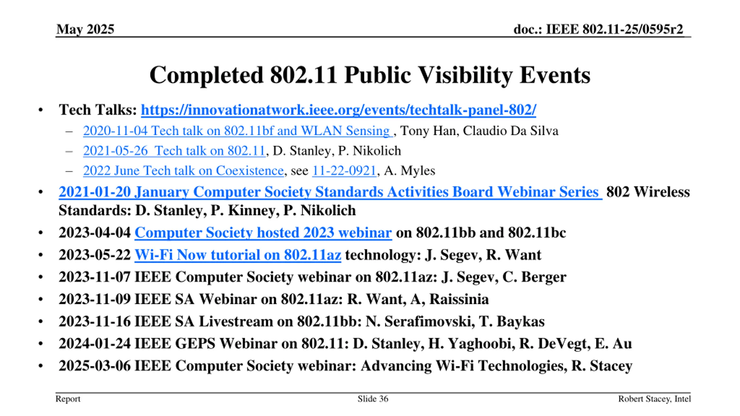 May 2025 doc.: IEEE 802.11-25/0595r2 Completed 802.11 Public Visibility Events Tech Talks: https://innovationatwork.ieee.org/events/techtalk-panel-802/ 2020-11-04 Tech talk on 802.11bf and WLAN Sensing , Tony Han, Claudio Da Silva 2021-05-26 Tech talk on 802.11, D. Stanley, P. Nikolich 2022 June Tech talk on Coexistence, see 11-22-0921, A. Myles 2021-01-20 January Computer Society Standards Activities Board Webinar Series 802 Wireless Standards: D. Stanley, P. Kinney, P. Nikolich 2023-04-04 Computer Society hosted 2023 webinar on 802.11bb and 802.11bc 2023-05-22 Wi-Fi Now tutorial on 802.11az technology: J. Segev, R. Want 2023-11-07 IEEE Computer Society webinar on 802.11az: J. Segev, C. Berger 2023-11-09 IEEE SA Webinar on 802.11az: R. Want, A, Raissinia 2023-11-16 IEEE SA Livestream on 802.11bb: N. Serafimovski, T. Baykas 2024-01-24 IEEE GEPS Webinar on 802.11: D. Stanley, H. Yaghoobi, R. DeVegt, E. Au 2025-03-06 IEEE Computer Society webinar: Advancing Wi-Fi Technologies, R. Stacey Report Slide 36 Robert Stacey, Intel