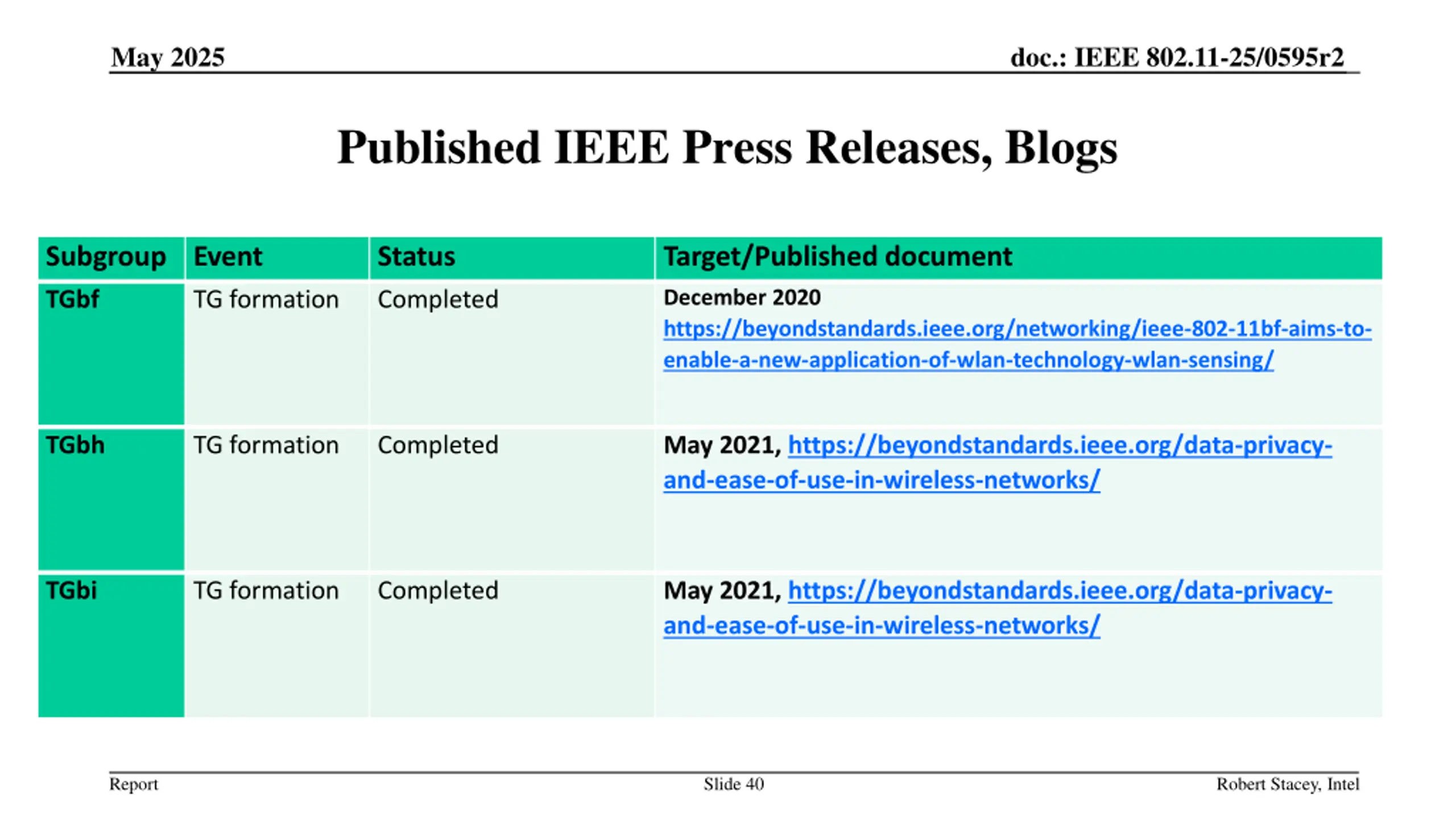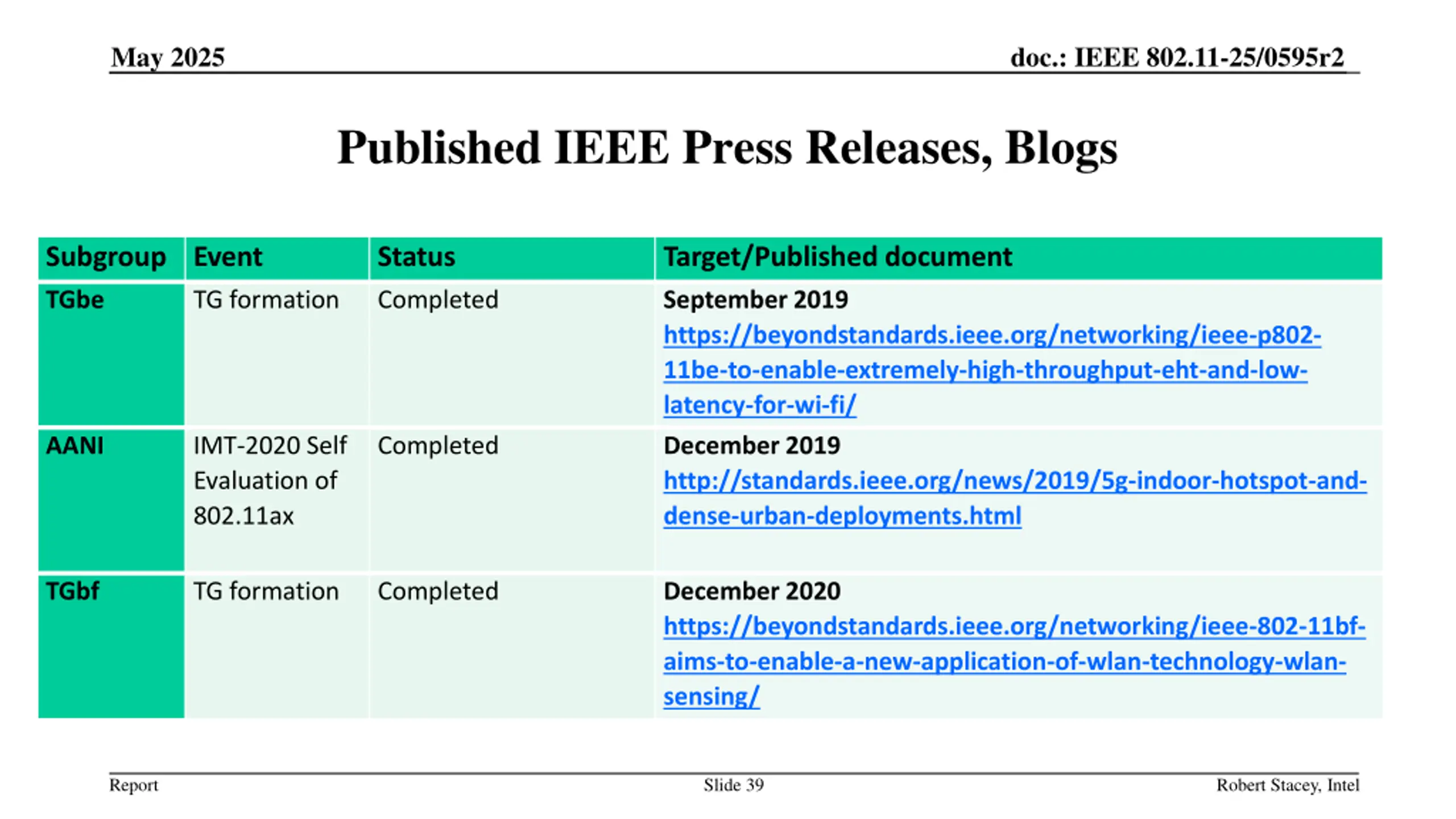 May 2025 doc.: IEEE 802.11-25/0595r2 Published IEEE Press Releases, Blogs Subgroup Event Status Target/Published document TGbe TG formation Completed September 2019 https://beyondstandards.ieee.org/networking/ieee-p802- 11be-to-enable-extremely-high-throughput-eht-and-low- latency-for-wi-fi/ December 2019 http://standards.ieee.org/news/2019/5g-indoor-hotspot-and- dense-urban-deployments.html AANI IMT-2020 Self Evaluation of 802.11ax Completed TGbf TG formation Completed December 2020 https://beyondstandards.ieee.org/networking/ieee-802-11bf- aims-to-enable-a-new-application-of-wlan-technology-wlan- sensing/ Report Slide 39 Robert Stacey, Intel