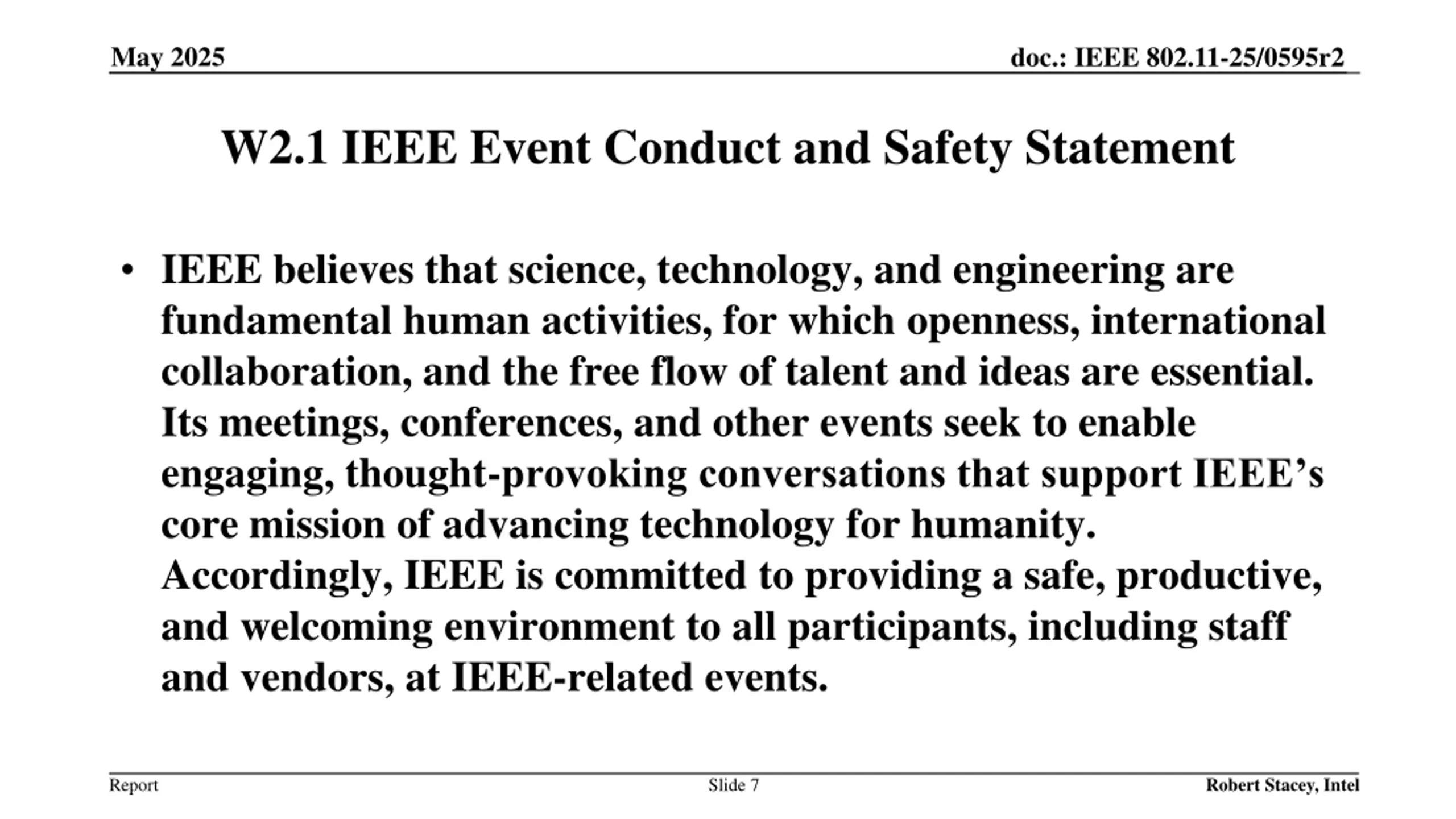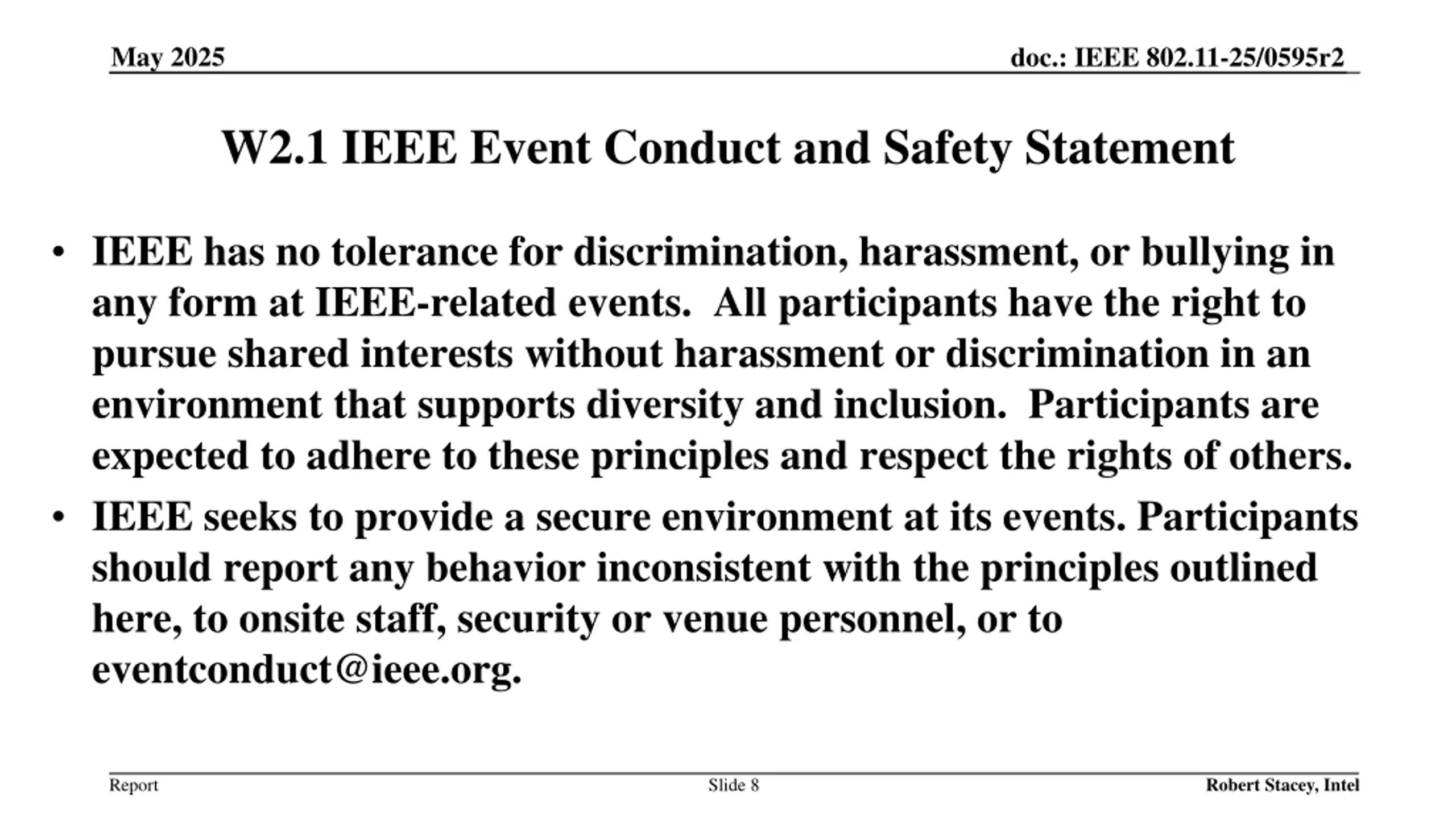 May 2025 doc.: IEEE 802.11-25/0595r2 W2.1 IEEE Event Conduct and Safety Statement IEEE believes that science, technology, and engineering are fundamental human activities, for which openness, international collaboration, and the free flow of talent and ideas are essential. Its meetings, conferences, and other events seek to enable engaging, thought-provoking conversations that support IEEE s core mission of advancing technology for humanity. Accordingly, IEEE is committed to providing a safe, productive, and welcoming environment to all participants, including staff and vendors, at IEEE-related events. Robert Stacey, Intel Report Slide 7