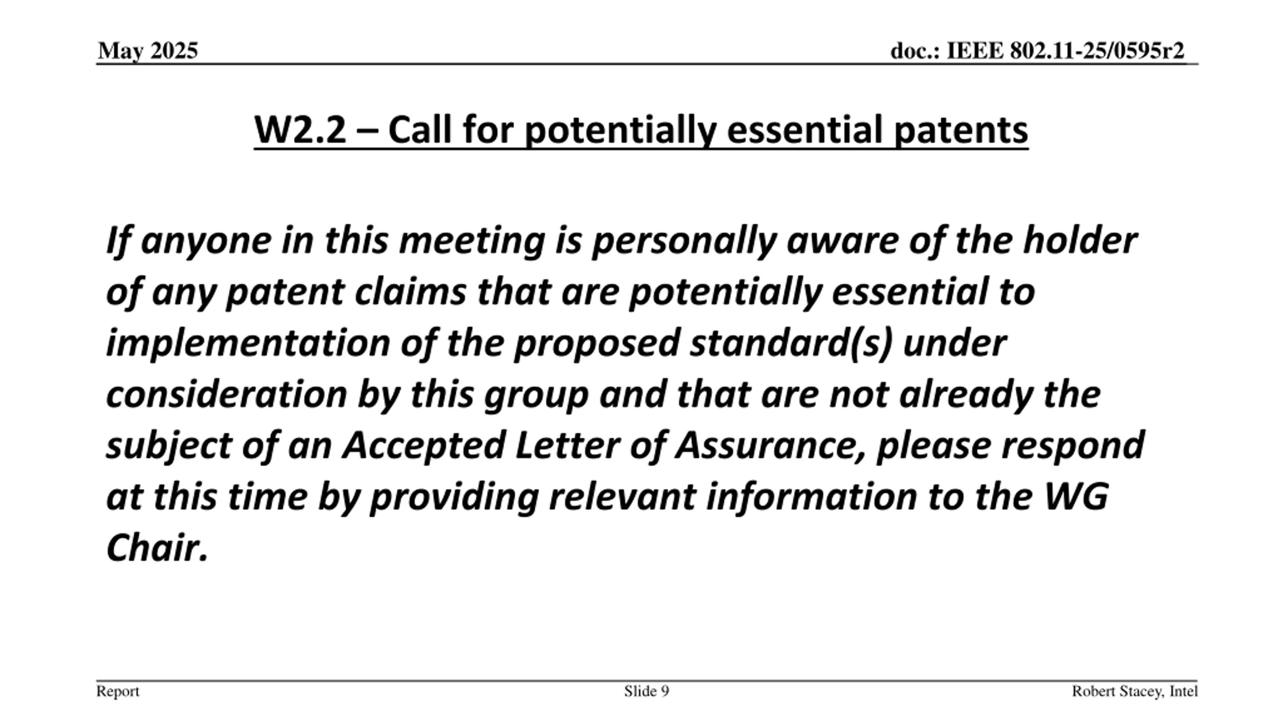 May 2025 doc.: IEEE 802.11-25/0595r2 W2.2 Call for potentially essential patents If anyone in this meeting is personally aware of the holder of any patent claims that are potentially essential to implementation of the proposed standard(s) under consideration by this group and that are not already the subject of an Accepted Letter of Assurance, please respond at this time by providing relevant information to the WG Chair. Report Slide 9 Robert Stacey, Intel