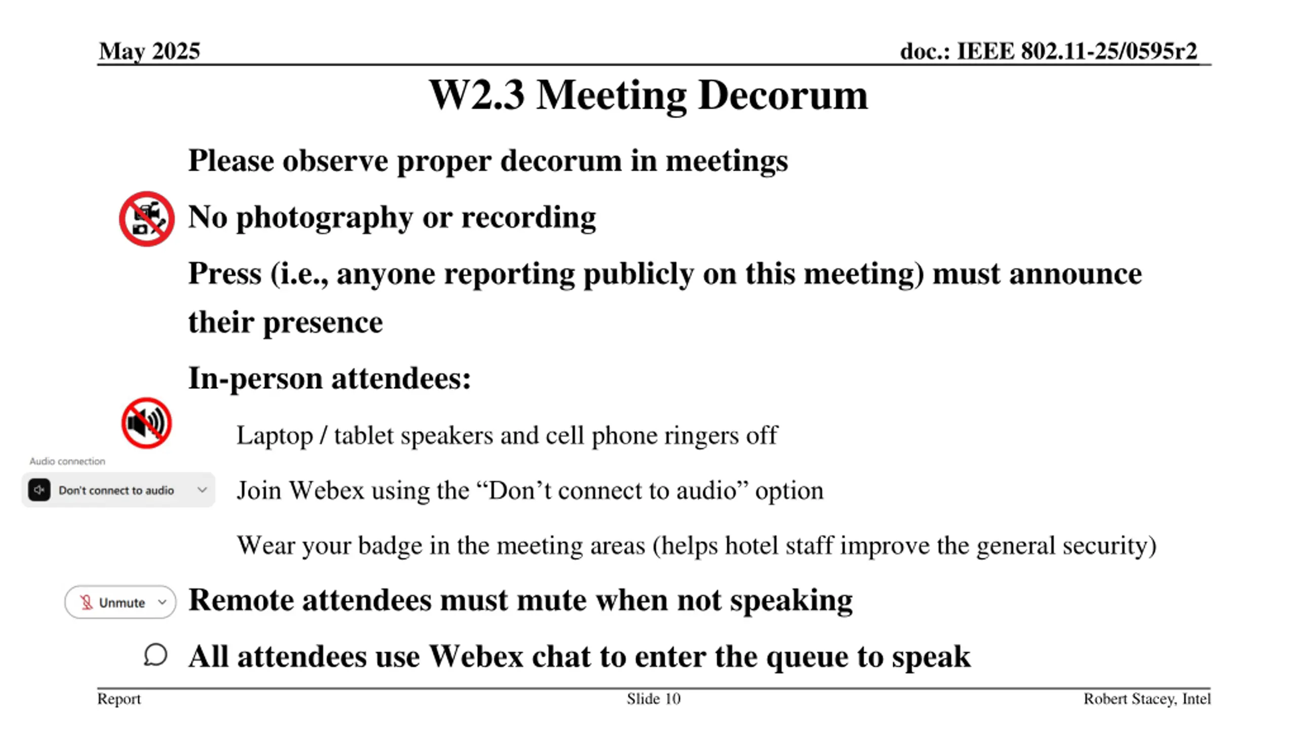 May 2025 doc.: IEEE 802.11-25/0595r2 W2.3 Meeting Decorum Please observe proper decorum in meetings No photography or recording Press (i.e., anyone reporting publicly on this meeting) must announce their presence In-person attendees: Laptop / tablet speakers and cell phone ringers off Join Webex using the Don t connect to audio option Wear your badge in the meeting areas (helps hotel staff improve the general security) Remote attendees must mute when not speaking All attendees use Webex chat to enter the queue to speak Report Slide 10 Robert Stacey, Intel