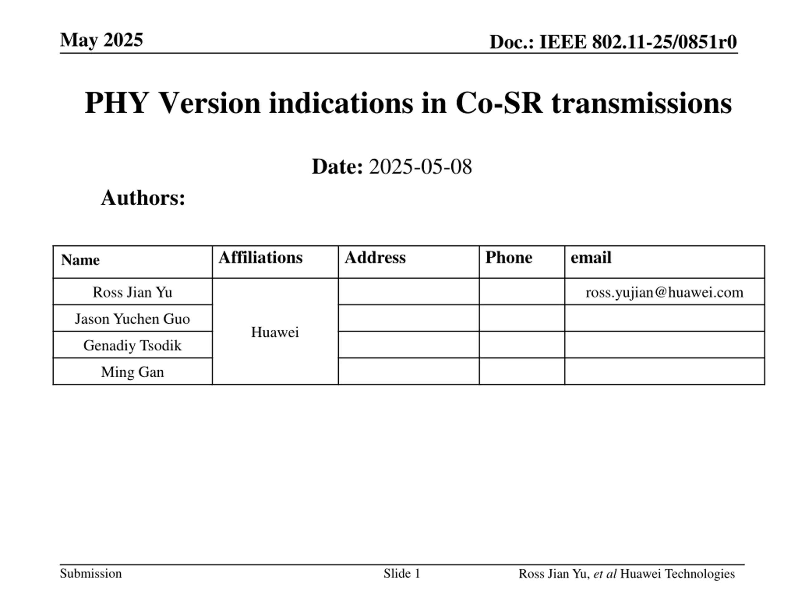 May 2025 Doc.: IEEE 802.11-25/0851r0 PHY Version indications in Co-SR transmissions Date: 2025-05-08 Authors: Affiliations Address Phone email Name Ross Jian Yu ross.yujian@huawei.com Jason Yuchen Guo Huawei Genadiy Tsodik Ming Gan Submission Slide 1 Ross Jian Yu, et al Huawei Technologies