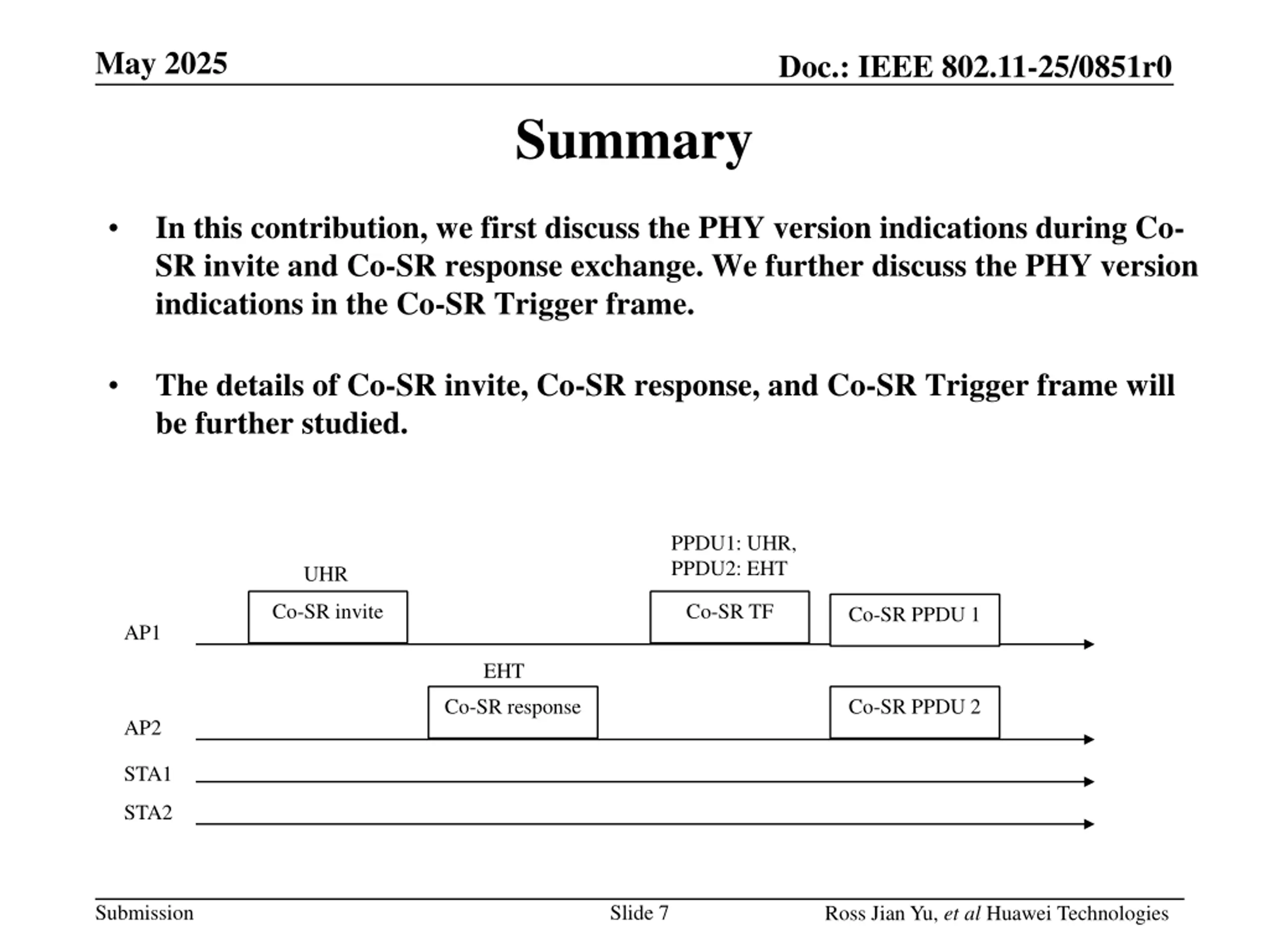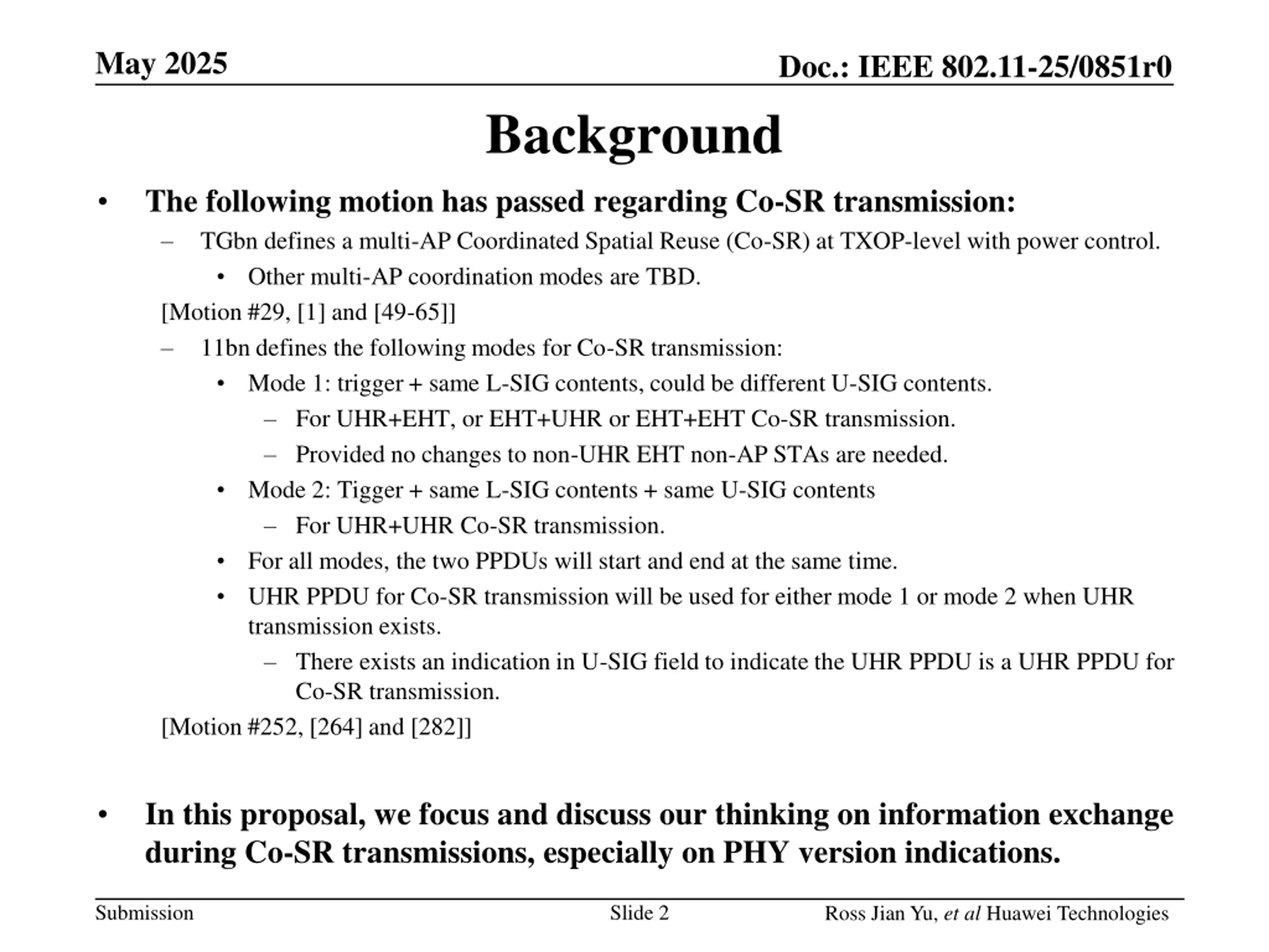 May 2025 Doc.: IEEE 802.11-25/0851r0 Background The following motion has passed regarding Co-SR transmission: TGbn defines a multi-AP Coordinated Spatial Reuse (Co-SR) at TXOP-level with power control. Other multi-AP coordination modes are TBD. [Motion #29, [1] and [49-65]] 11bn defines the following modes for Co-SR transmission: Mode 1: trigger + same L-SIG contents, could be different U-SIG contents. For UHR+EHT, or EHT+UHR or EHT+EHT Co-SR transmission. Provided no changes to non-UHR EHT non-AP STAs are needed. Mode 2: Tigger + same L-SIG contents + same U-SIG contents For UHR+UHR Co-SR transmission. For all modes, the two PPDUs will start and end at the same time. UHR PPDU for Co-SR transmission will be used for either mode 1 or mode 2 when UHR transmission exists. There exists an indication in U-SIG field to indicate the UHR PPDU is a UHR PPDU for Co-SR transmission. [Motion #252, [264] and [282]] In this proposal, we focus and discuss our thinking on information exchange during Co-SR transmissions, especially on PHY version indications. Submission Slide 2 Ross Jian Yu, et al Huawei Technologies
