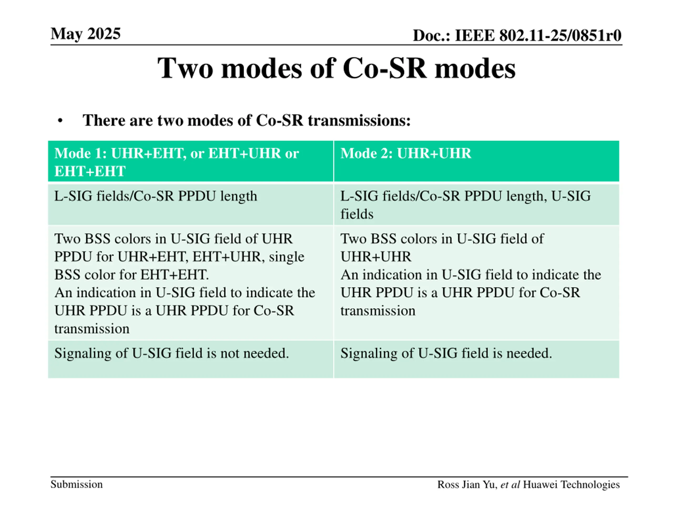 May 2025 Doc.: IEEE 802.11-25/0851r0 Two modes of Co-SR modes There are two modes of Co-SR transmissions: Mode 1: UHR+EHT, or EHT+UHR or EHT+EHT Mode 2: UHR+UHR L-SIG fields/Co-SR PPDU length L-SIG fields/Co-SR PPDU length, U-SIG fields Two BSS colors in U-SIG field of UHR PPDU for UHR+EHT, EHT+UHR, single BSS color for EHT+EHT. An indication in U-SIG field to indicate the UHR PPDU is a UHR PPDU for Co-SR transmission Two BSS colors in U-SIG field of UHR+UHR An indication in U-SIG field to indicate the UHR PPDU is a UHR PPDU for Co-SR transmission Signaling of U-SIG field is not needed. Signaling of U-SIG field is needed. Submission Ross Jian Yu, et al Huawei Technologies