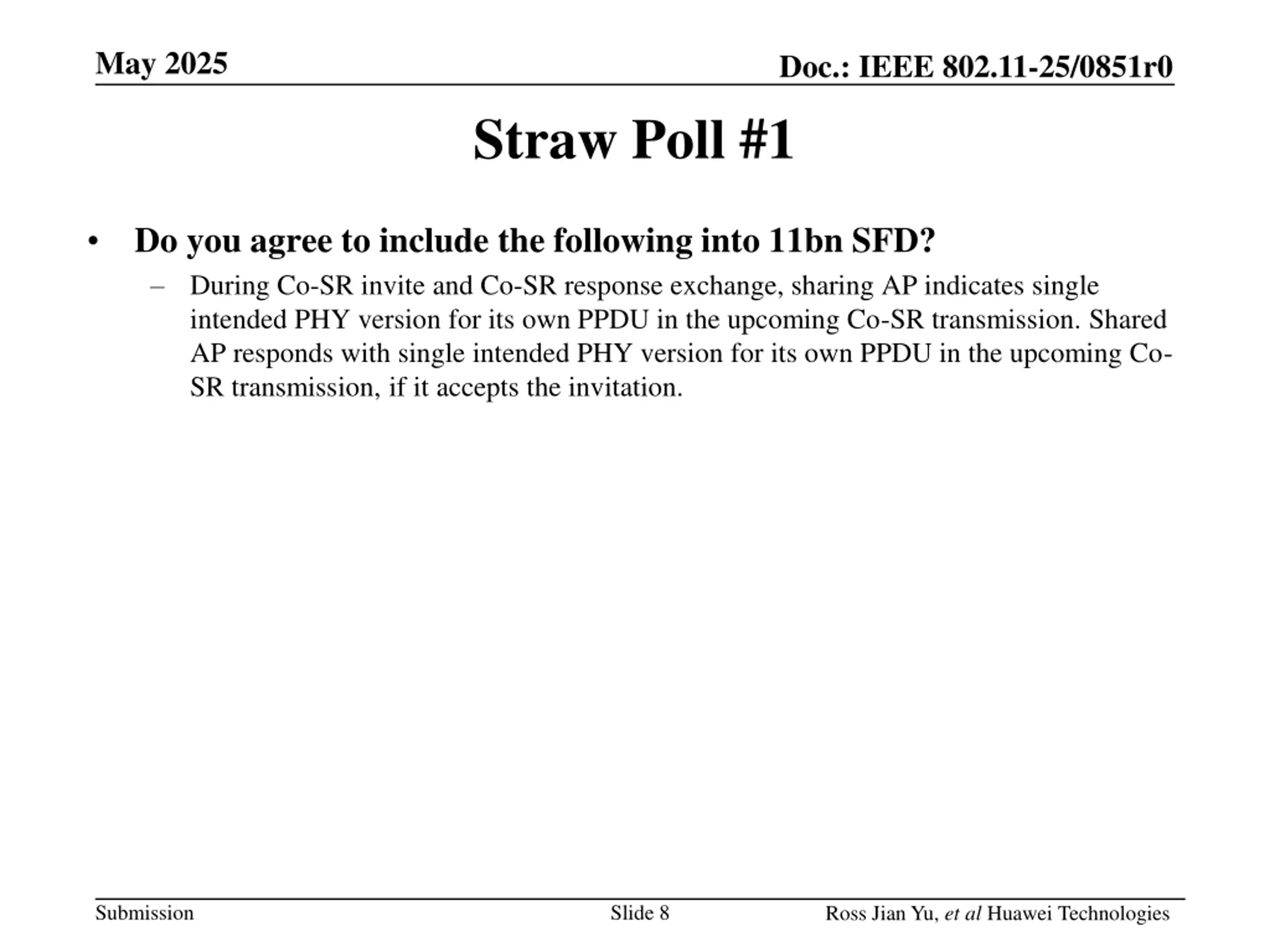 May 2025 Doc.: IEEE 802.11-25/0851r0 Straw Poll #1 Do you agree to include the following into 11bn SFD? During Co-SR invite and Co-SR response exchange, sharing AP indicates single intended PHY version for its own PPDU in the upcoming Co-SR transmission. Shared AP responds with single intended PHY version for its own PPDU in the upcoming Co- SR transmission, if it accepts the invitation. Submission Slide 8 Ross Jian Yu, et al Huawei Technologies