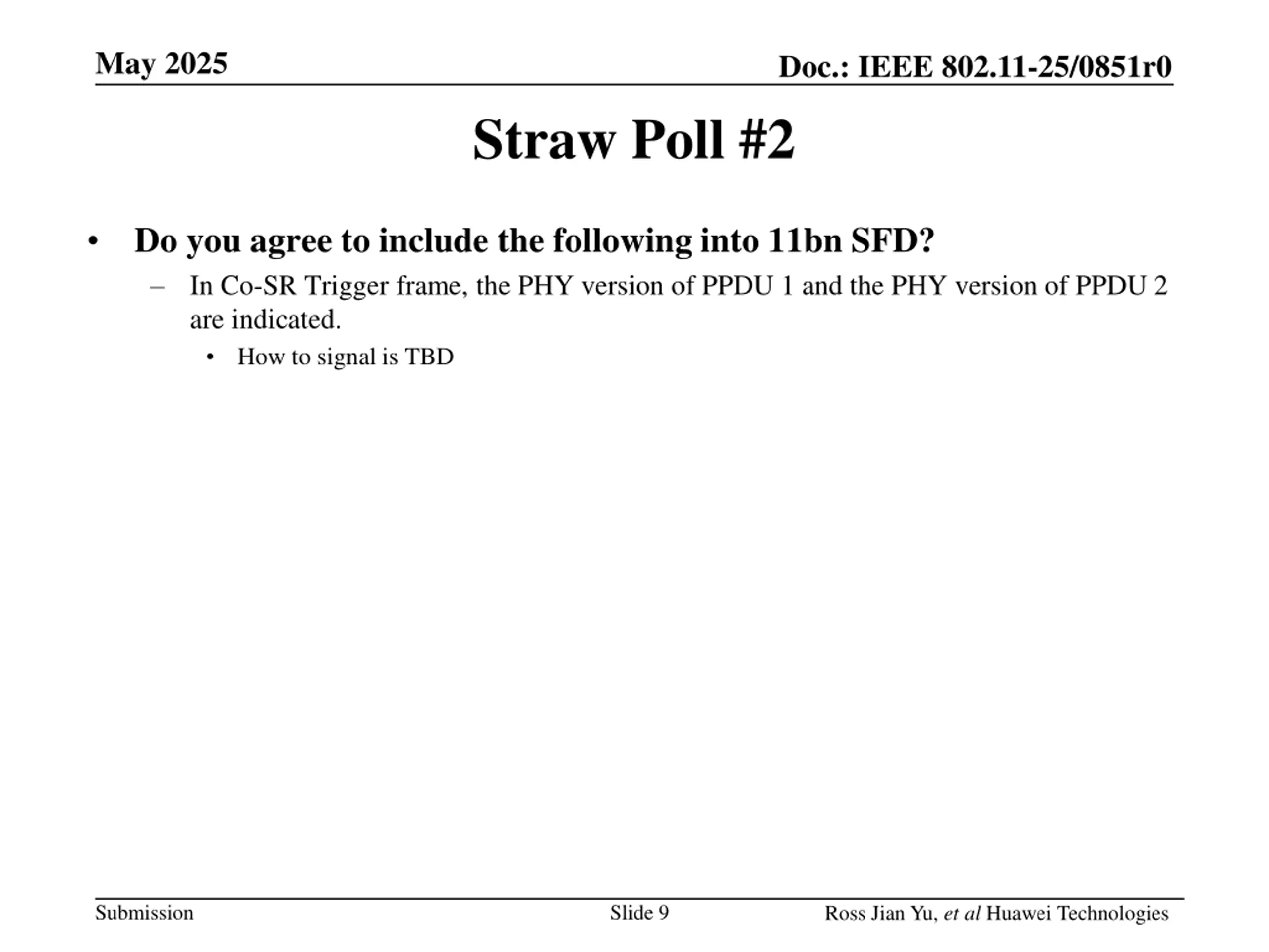 May 2025 Doc.: IEEE 802.11-25/0851r0 Straw Poll #2 Do you agree to include the following into 11bn SFD? In Co-SR Trigger frame, the PHY version of PPDU 1 and the PHY version of PPDU 2 are indicated. How to signal is TBD Submission Slide 9 Ross Jian Yu, et al Huawei Technologies