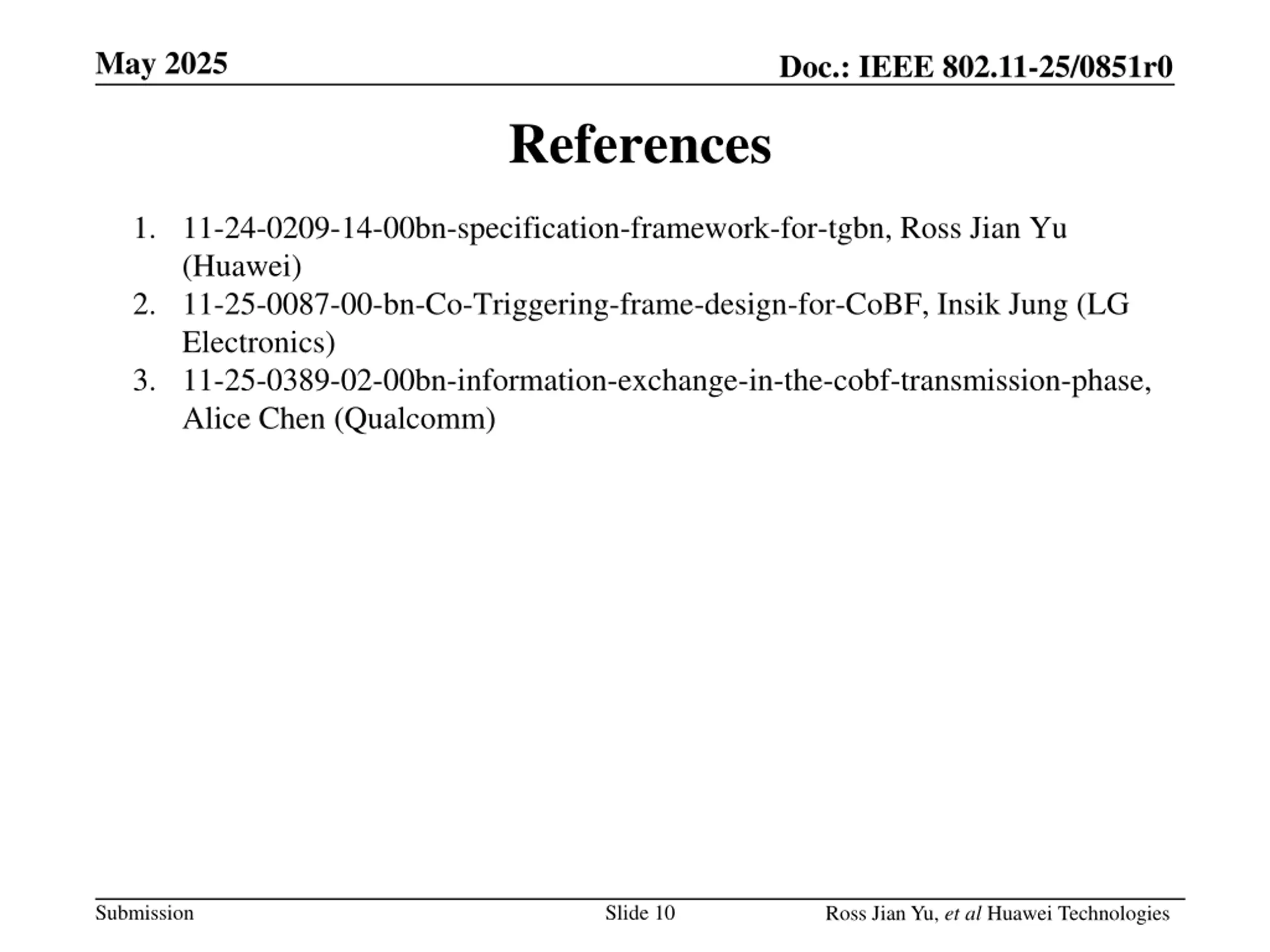 May 2025 Doc.: IEEE 802.11-25/0851r0 References 1. 11-24-0209-14-00bn-specification-framework-for-tgbn, Ross Jian Yu (Huawei) 2. 11-25-0087-00-bn-Co-Triggering-frame-design-for-CoBF, Insik Jung (LG Electronics) 3. 11-25-0389-02-00bn-information-exchange-in-the-cobf-transmission-phase, Alice Chen (Qualcomm) Submission Slide 10 Ross Jian Yu, et al Huawei Technologies